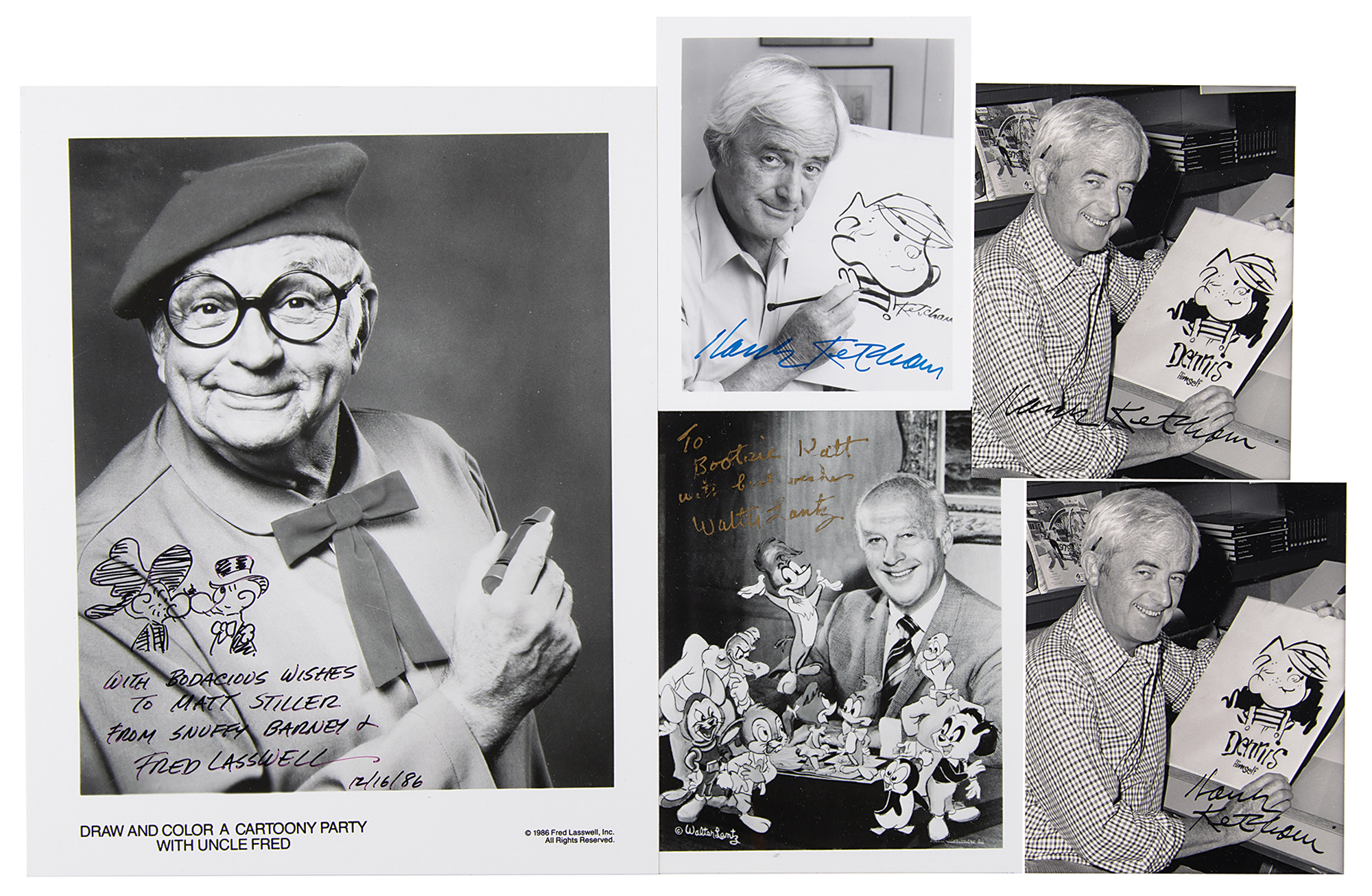 Five glossy photos of noted cartoonists, ranging in size from 4 x 5 to 8 x 10, each signed in ink by the subject. Includes: Hank Ketcham (3), Walter Lantz, and Fred Lasswell (adding sketches of Snuffy and Barney). In fine condition.