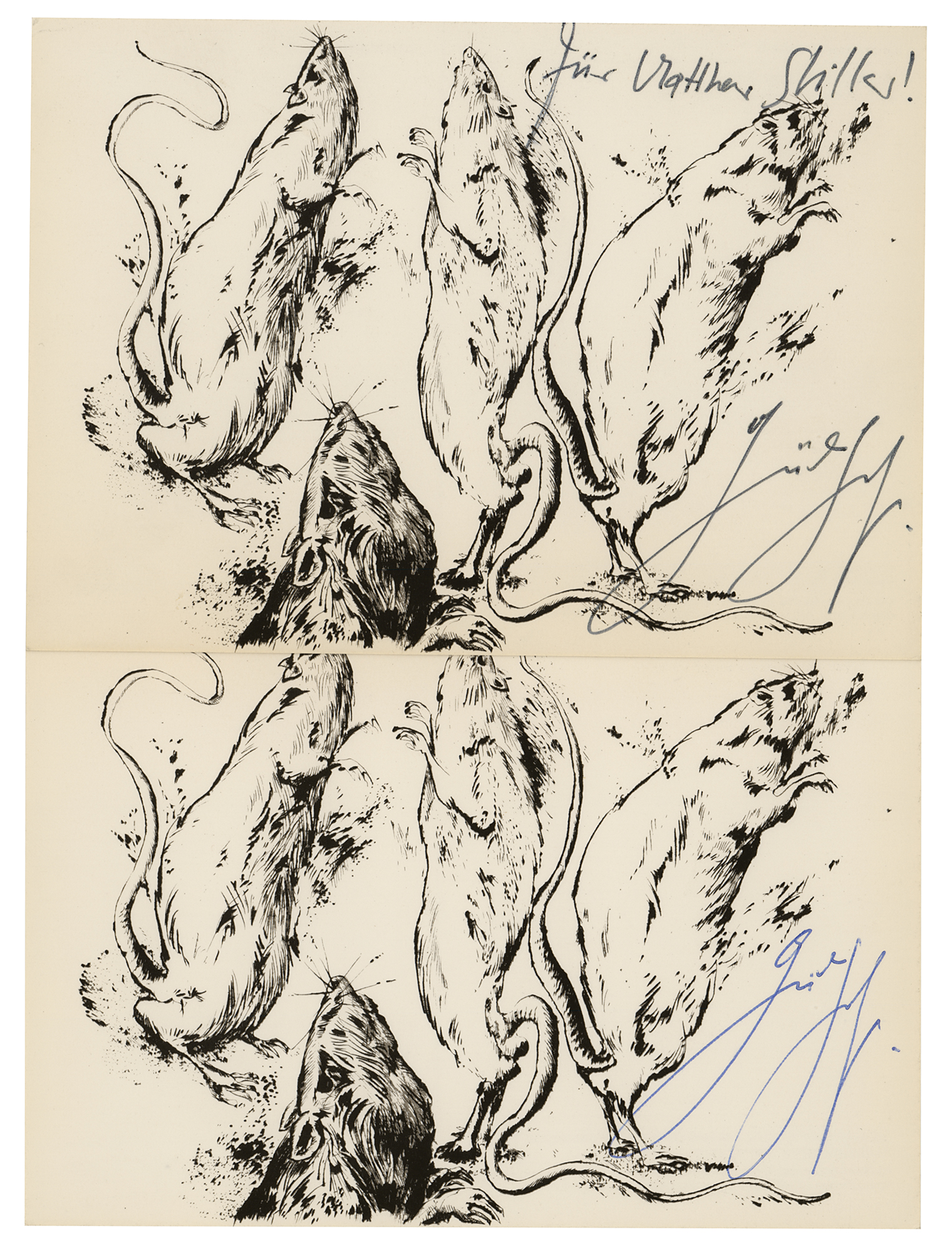 German novelist, poet, playwright, illustrator, graphic artist, and sculptor (1927-2015) who received the 1999 Nobel Prize in Literature. Two 5.75 x 4 postcards of a beguiling Gunter Grass drawing of a pack of rats, each signed in ink by the Nobel Prize winner (with one inscribed). In very fine condition. Accompanied by both original mailing envelopes.