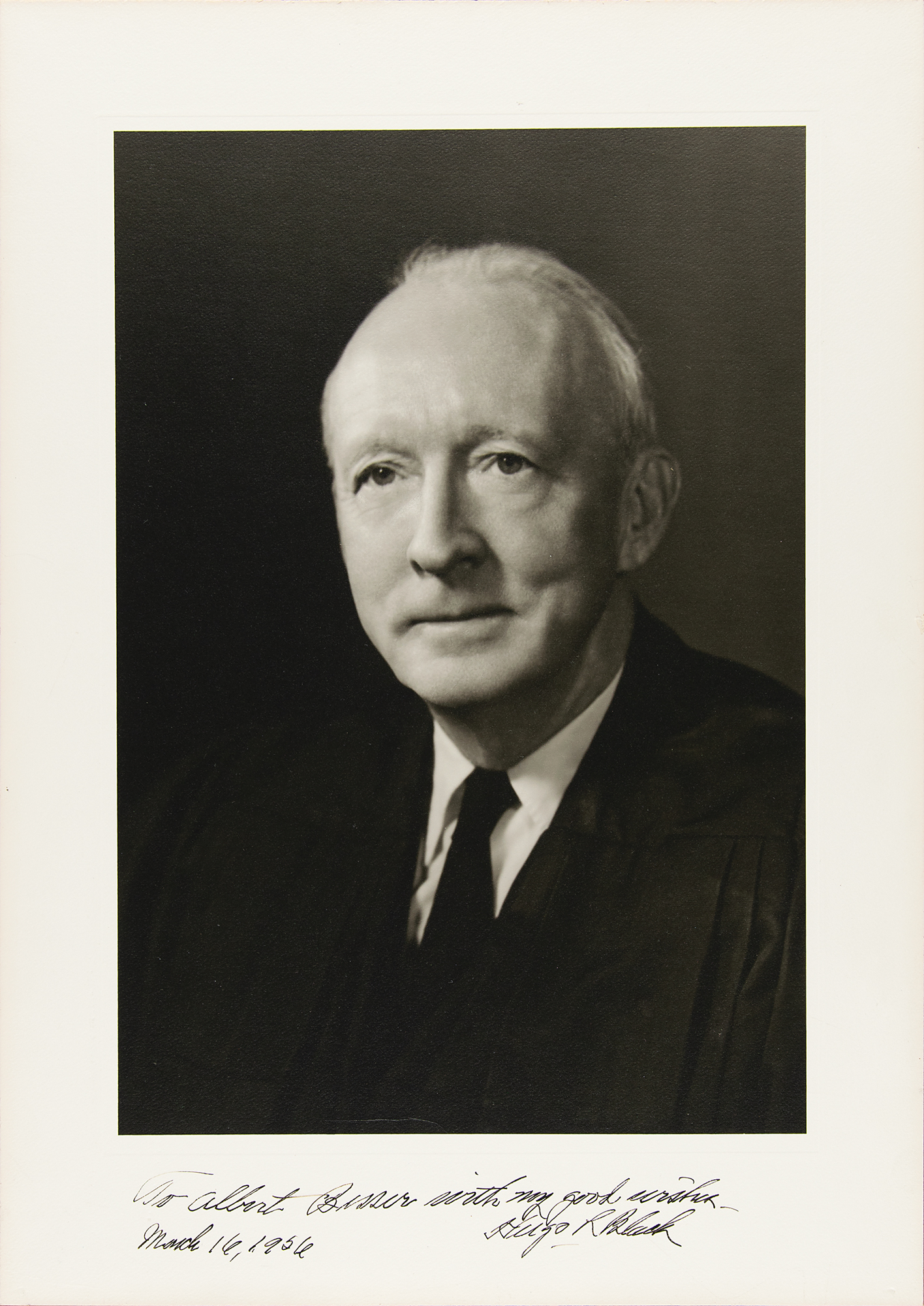 Impressively sized vintage matte-finish 12 x 17 photo of Justice Black in a suit and tie, signed and inscribed in the lower border in black ink, "To Albert Besser with my good wishes, Hugo L. Black, March 16, 1956.” Applied to a same-size mount and in very fine condition.