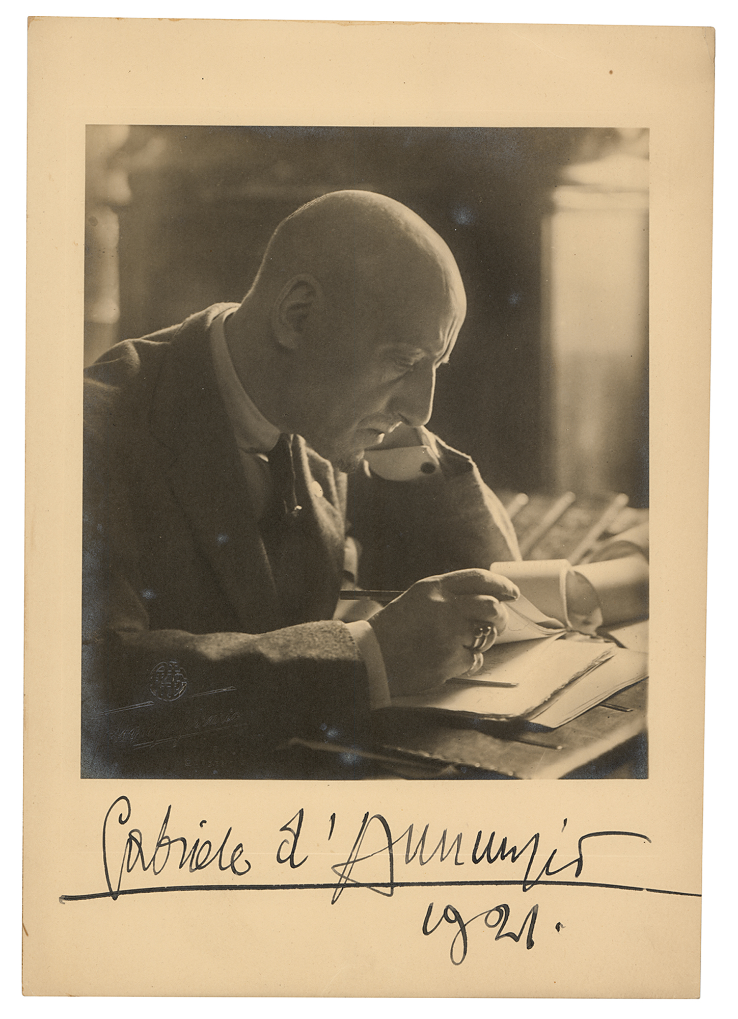 Italian poet, novelist, and dramatist (1863-1938) who distinguished himself as a heroic aviator in WWI. Vintage matte-finish 8 x 11.5 Ferrario Studio portrait of Gabriele D'Annunzio reading intently at his desk, signed prominently in the lower border in fountain pen, with D'Annunzio adding the year, 1921." In fine condition, with scattered spots of silvering.