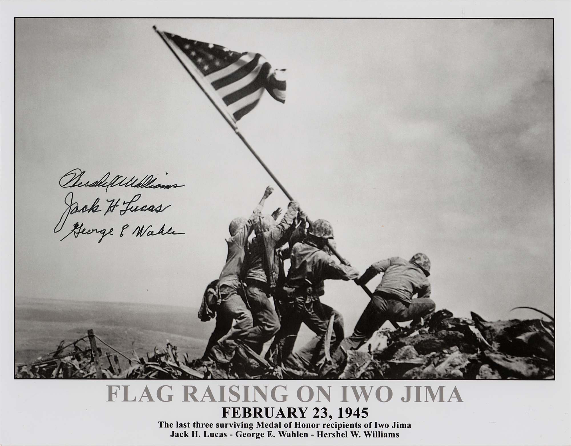 Iconic satin-finish 12.75 x 10 photo of the flag raising on Iwo Jima, signed in black felt tip by three Medal of Honor recipients who participated in the battle: Hershel Williams, Jack Lucas. and George Wahlen. In fine condition.