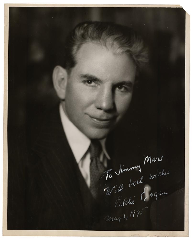 American boxer and bobsledder (1897-1967) who is notable as being the only person to win a gold medal at both the Summer and Winter Olympic Games in different disciplines. Eagan won his summer gold in boxing and his winter gold in the four-man bobsled. Vintage pearl-finish 8 x 10 photo of Eagan wearing a suit and tie, signed and inscribed in white ink, "To Jimmy Mars, with best wishes, Eddie Eagan, May 1, 1945.” Reverse bears a Shelburne Studios credit stamp. In very good to fine condition, with edge rippling, corner loss, and circular impressions from mounting remnants on the back. Accompanied by a full letter of authenticity from JSA.