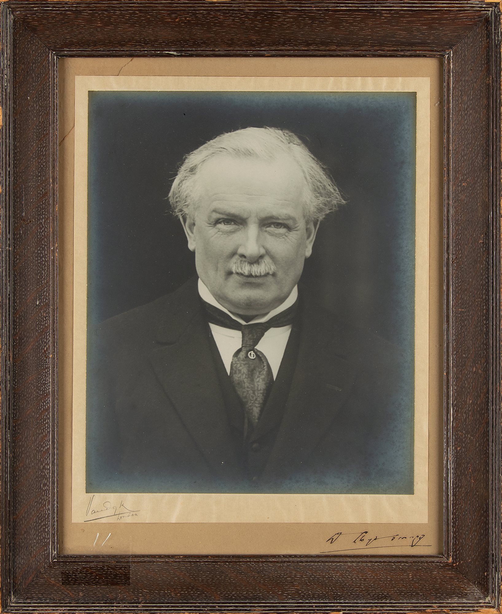 British statesman (1863-1945) who served as prime minister from 1916 to 1922, and who was a major player at the Paris Peace Conference of 1919, overseeing the decisions that determined Europe's postwar future. Exceptional vintage matte-finish 11.25 x 14 photo of David Lloyd George by the Vandyk Studio of London, signed on the original mount in black ink, "D. Lloyd George." The mount is also signed in pencil by the photographer. Framed to an overall size of 17.25 x 21.25. In very good to fine condition, with a tear to the top of the mount, and silvering to the perimeter of the image.