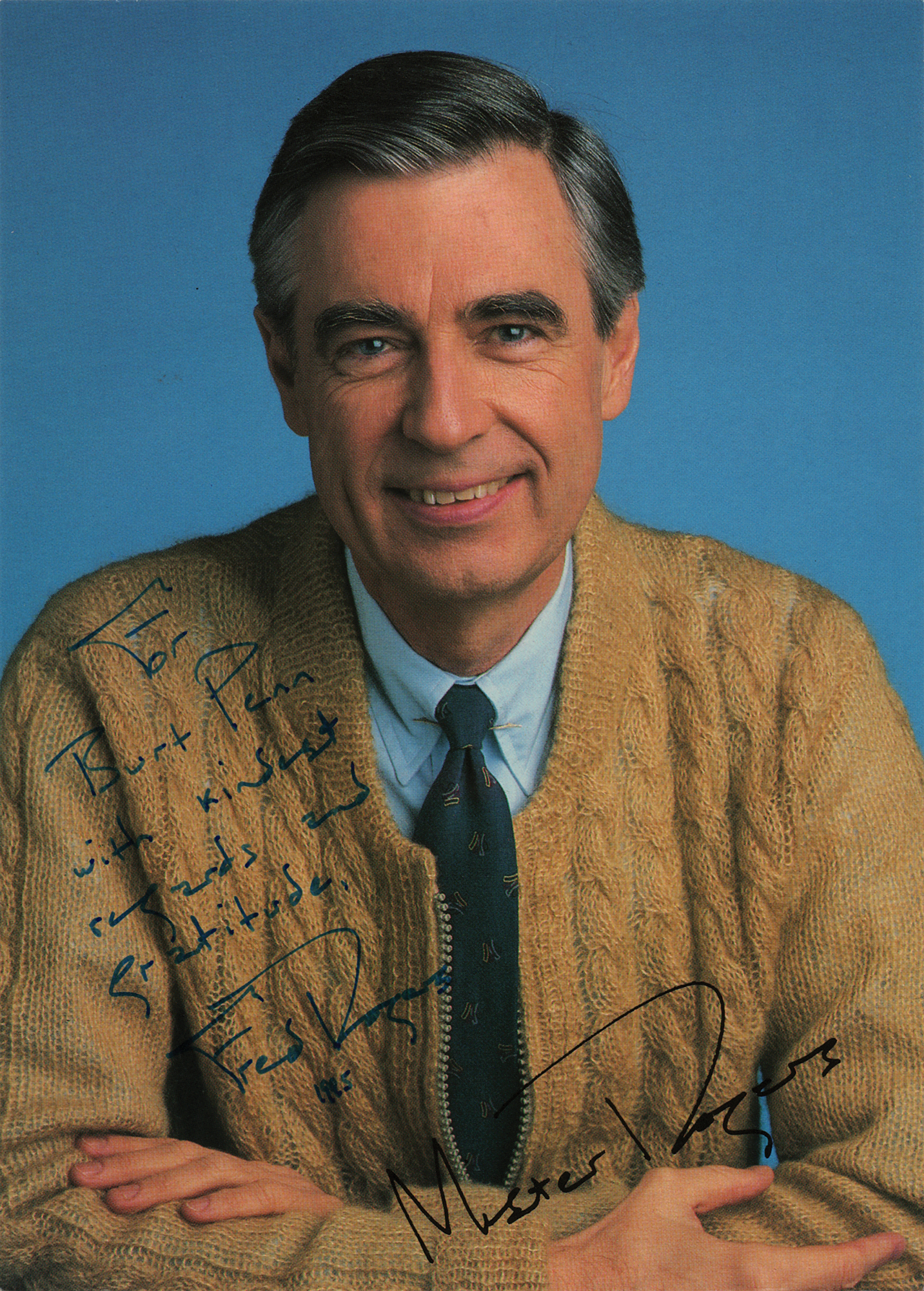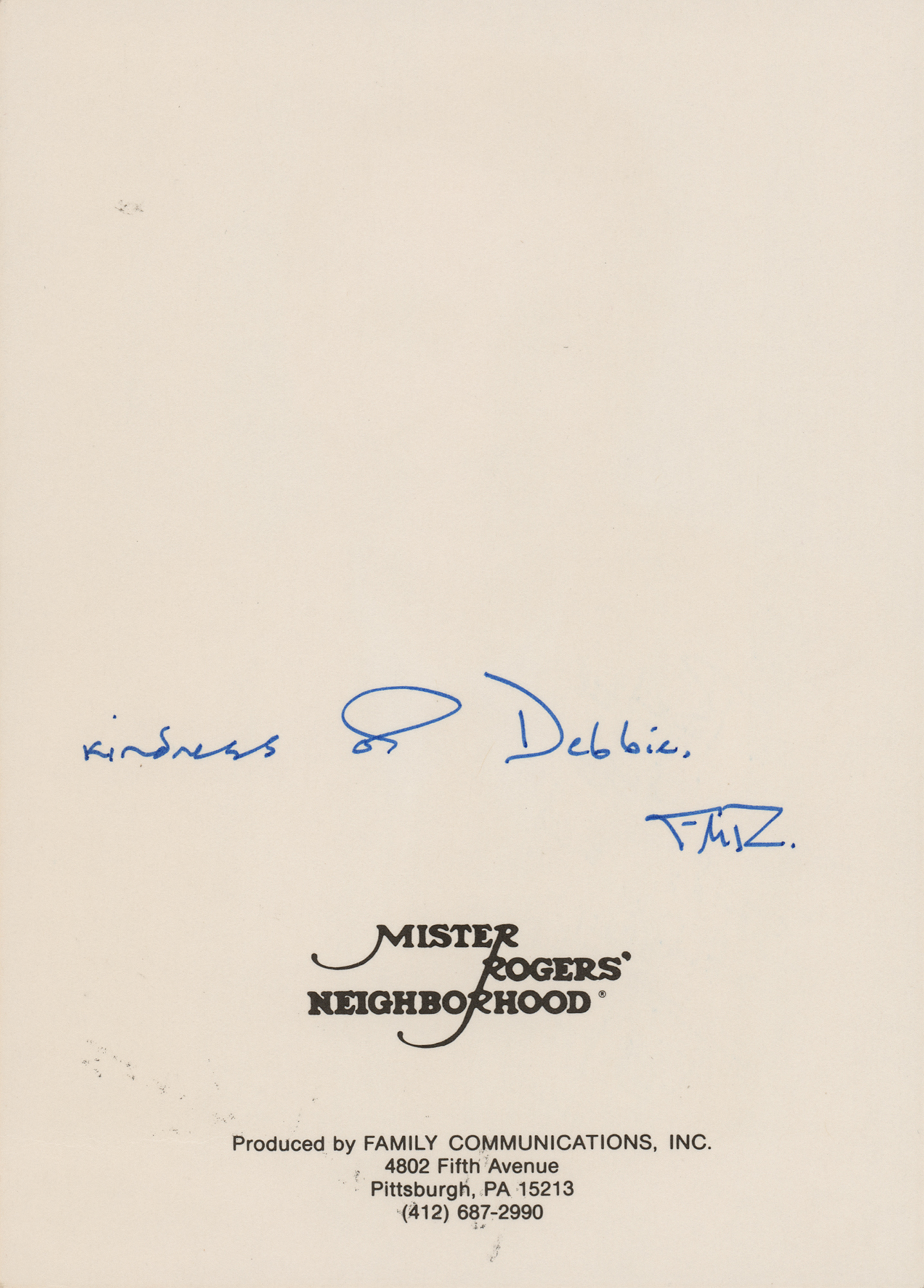 Color semi-glossy 5 x 7 Mister Rogers' Neighborhood promotional photo of the show's benevolent host, signed and inscribed in felt tip, "For Burt Penn, with kindest regards and gratitude, Fred Rogers, 1995," who adds a handwritten note on the back, "Kindness of Debbie, FMR." The front bears a preprinted "Mister Rogers" autograph. In fine condition.