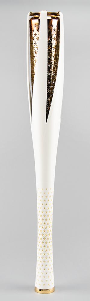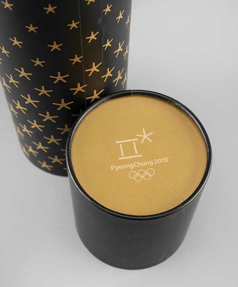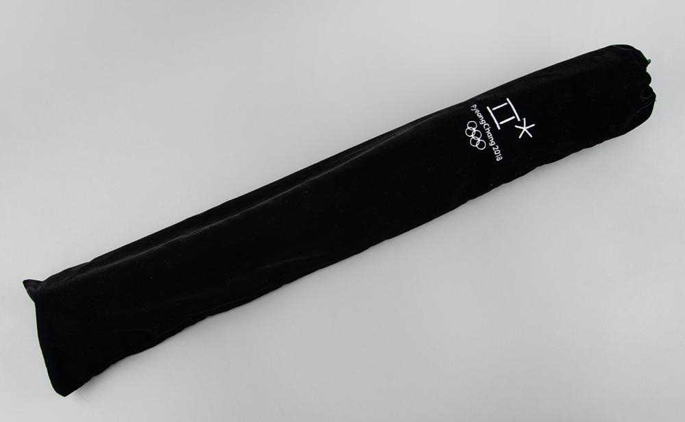 Official 2018 PyeongChang Winter Olympics torch, constructed of a white metal exterior shell with a gold-colored metal interior, measuring 27.5″ in length and 3.25″ at its widest point, designed and manufactured by Young-se Kim, Inno Design / Groupe Hanhwa. At the top, the exterior shell is divided into five vertical branches to form a pentagonal shape, representing the sporting passion and spirit that unites the five Olympic continents (Africa, Europe, the Americas, Asia, and Australia). A colorful raised PyeongChang 2018 emblem decorates the body of the torch, and the handle is printed with golden stars. The white and gold colors used in the design represent the snow and ice of the Winter Games, as well as the Olympic flame, and correspond with the color scheme of the PyeongChang relay. The 700-millimeter length of the torch represents the altitude of PyeongChang, which lies 700 meters above sea level. The torch is specially designed so that the flame can burn continuously despite inclement weather: it generates an air tunnel that sends more oxygen to the flame, and a pentagonal hole at the bottom of the torch allows water to drain. Complete with its velvet drawstring bag and attractive carrying tube.