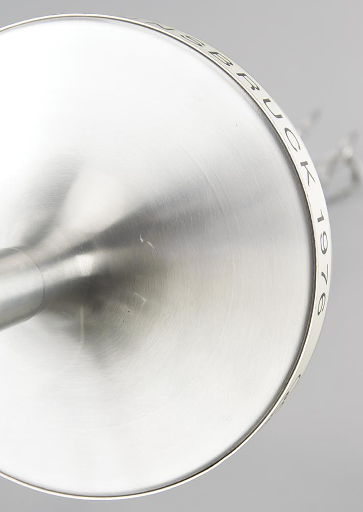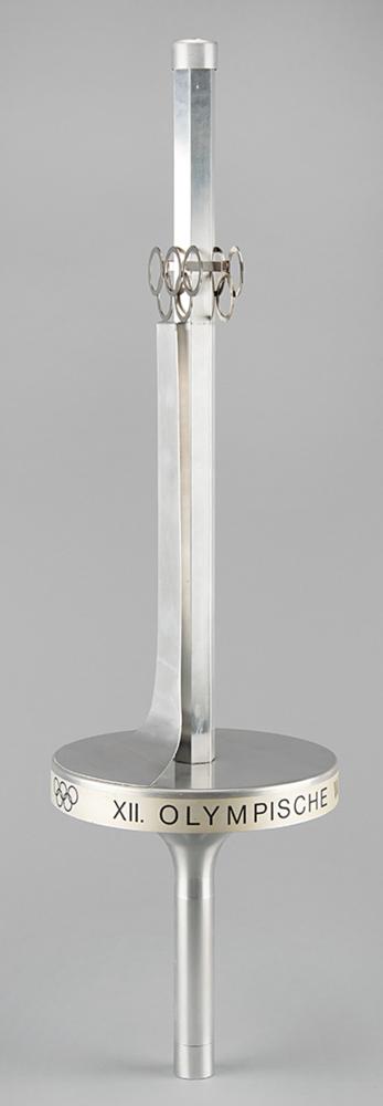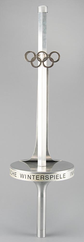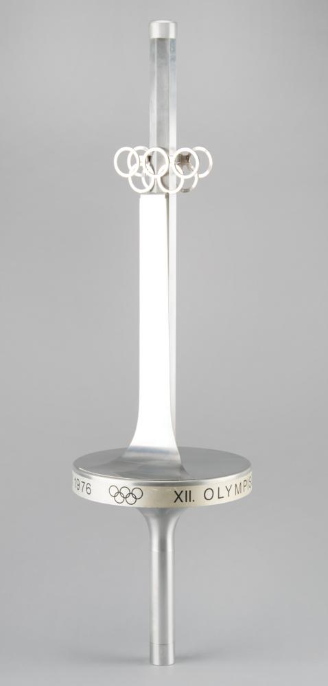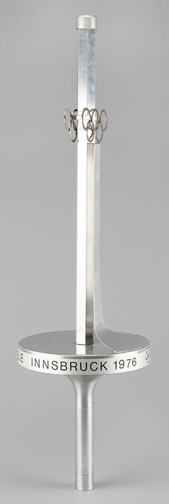 Extremely rare official 1976 Innsbruck Winter Olympics torch, constructed of aluminum alloy and steel, measuring 29″ in length and 8.25″ at its widest point, designed by Vereinigte Metallwerke Ranshofen Berndorf. The upper shaft of the torch is hexagonal and features a pair of Olympic rings in openwork, with the curving metal strip extending from rings to platform representing a ski jump. The rim of the platform bears an inscribed label with Olympic rings, "XII. Olympische Winterspiele Innsbruck 1976," the base of the handle bears a manufacturer's label, and the top retains its original cap. The shaft, platform, and handle bear mild light marks and scuffs.
