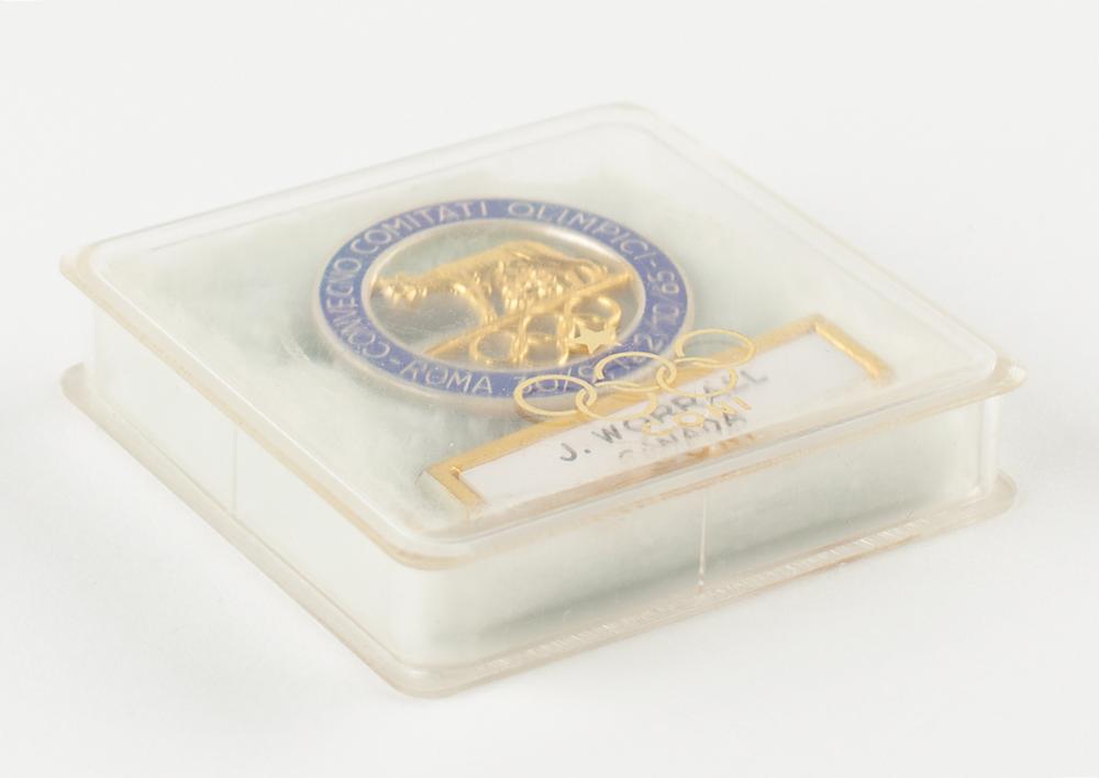 Attractive badge issued for the National Olympic Committees (ANOC) First General Assembly held in Rome, Italy, in 1965, 47 mm x 51 mm, featuring the gilt emblem of the 1960 Games (Capitoline Wolf with Romulus and Remus surmounting the Olympic rings), encircled by a blue enameled ring: "Convegno Comitati Olimpici, Roma, 30/9 1e 2/10/65." The recipient's name and nation, "J. Worrall, Canada," is inscribed in the lower tablet. Complete with its original plastic box, gilt-stamped with the Olympic rings on the lid.