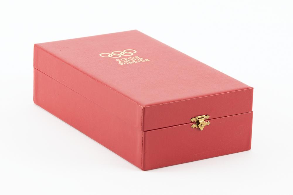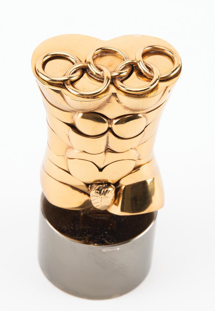 Limited edition ‘Olympic Torso’ bronze puzzle sculpture that was presented to Canadian Olympic administrator James Worrall in 1986. Designed by Spanish artist Miguel Berrocal, the statuette, numbered 27/250, 127 mm in height and 55 mm in diameter, features an abstract multilayered male torso with the uppermost section topped with the Olympic rings. The lower portion is engraved with the artist's name. Completed with the original presentation case, signed pamphlet, and certificate of authenticity, which states: “This sculpture is specially created by the Artist for the Comite International Olympique. 250 exemplars in bronze are lost-wax cast, signed and numbered from 1/250 to 250/250.” The underside of the presentation case, which bears some soiling, features an affixed label issued to “Monsieur James Worrall, c/o Ontario Sports Center.”