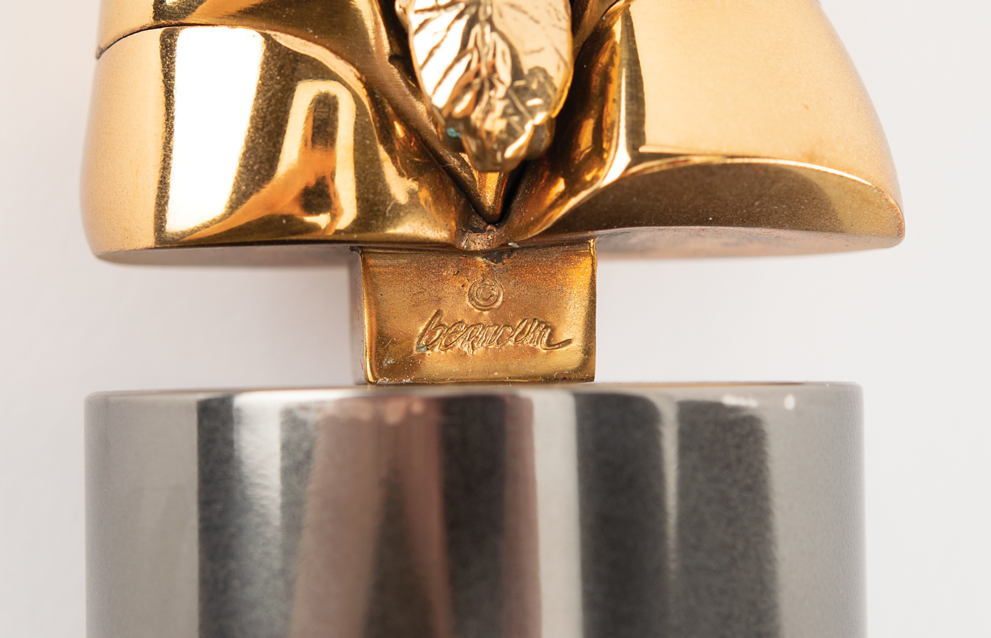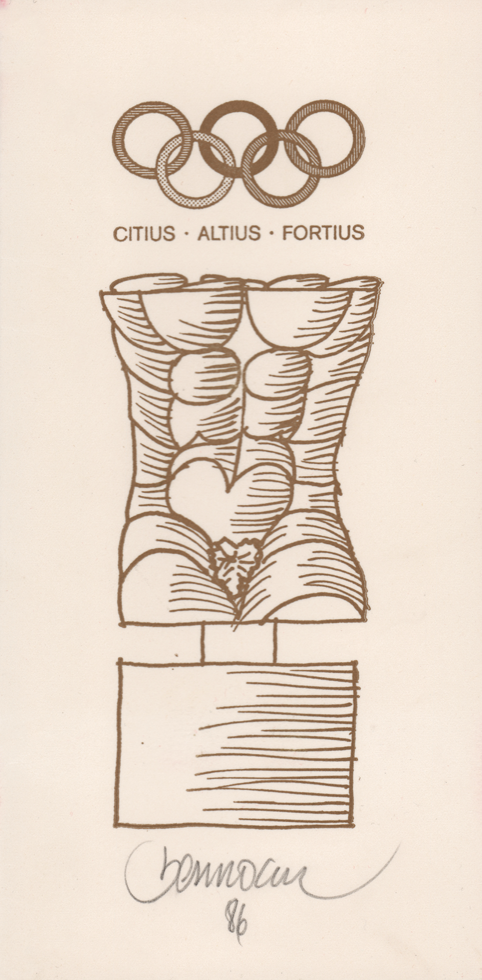 Limited edition ‘Olympic Torso’ bronze puzzle sculpture that was presented to Canadian Olympic administrator James Worrall in 1986. Designed by Spanish artist Miguel Berrocal, the statuette, numbered 27/250, 127 mm in height and 55 mm in diameter, features an abstract multilayered male torso with the uppermost section topped with the Olympic rings. The lower portion is engraved with the artist's name. Completed with the original presentation case, signed pamphlet, and certificate of authenticity, which states: “This sculpture is specially created by the Artist for the Comite International Olympique. 250 exemplars in bronze are lost-wax cast, signed and numbered from 1/250 to 250/250.” The underside of the presentation case, which bears some soiling, features an affixed label issued to “Monsieur James Worrall, c/o Ontario Sports Center.”