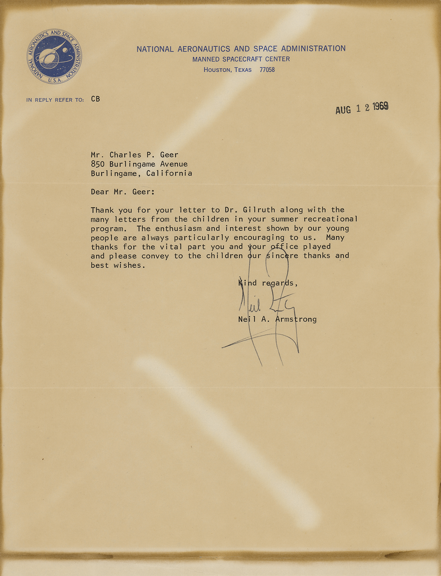 TLS, one page, 8 x 10.5, NASA letterhead, August 12, 1969. Letter to Charles P. Geer, dated just two days after he emerged from quarantine following the successful Apollo 11 mission. In full: "Thank you for your letter to Dr. Gilruth along with the many letters from the children in your summer recreational program. The enthusiasm and interest shown by our young people are always particularly encouraging to us. Many thanks for the vital part you and your office played and please convey to the children our sincere thanks and best wishes." In very good to fine condition, with irregular overall toning. Accompanied by the original mailing envelope.