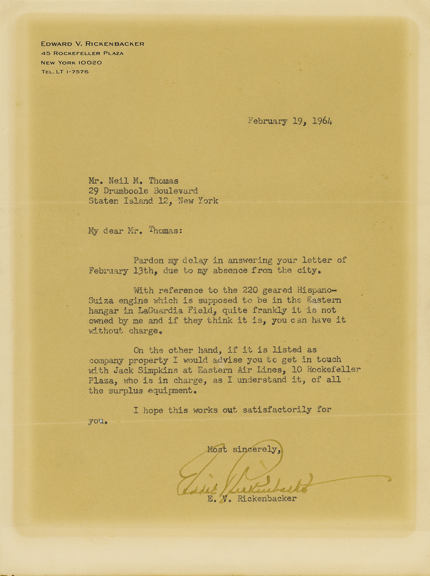 TLS, one page, 7.25 x 9.75, personal letterhead, February 19, 1964. Letter to Neil M. Thomas, in part: “With reference to the 220 geared Hispano-Suiza engine which is supposed to be in the Eastern hangar in LaGuardia Field, quite frankly it is not owned by me and if they think it is, you can have it without charge. On the other hand, if it is listed as company property I would advise you to get in touch with Jack Simpkins at Eastern Air Lines, 10 Rockefeller Plaza, who is in charge, as I understand it, of all the surplus equipment.” In very good to fine condition, with toning from prior display.