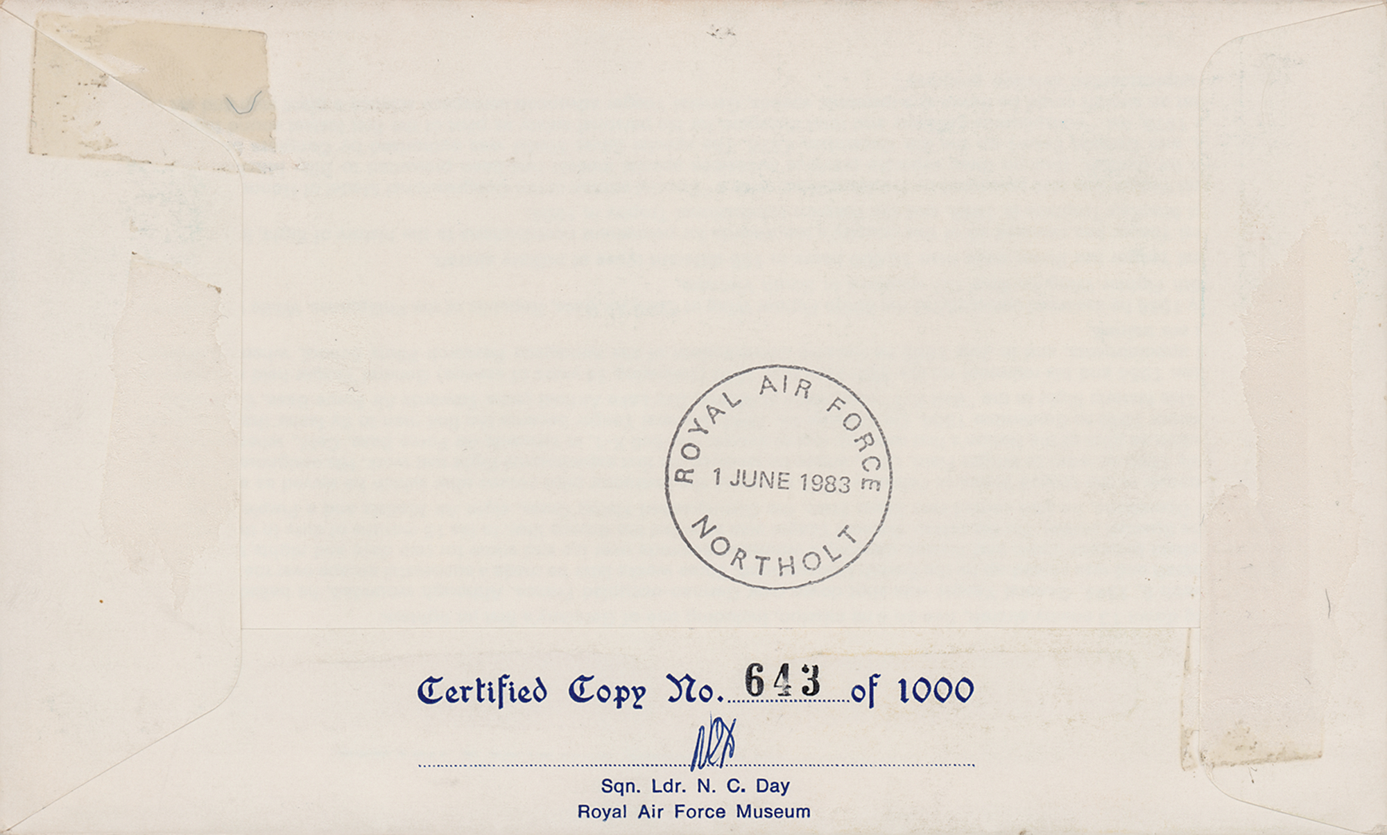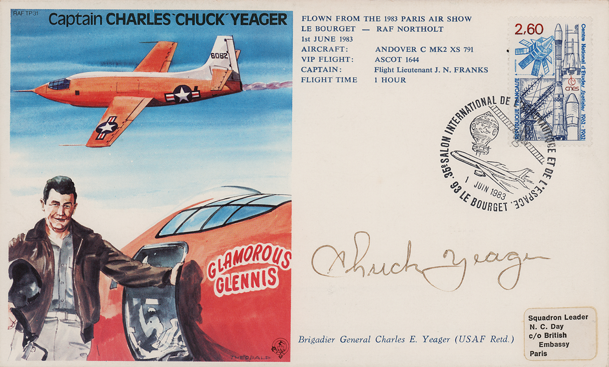 Uncommon limited edition 7.5 x 4.5 cover flown from the 1983 Paris Air Show at Le Bourget Airport to the RAF Northolt station in England, numbered 643/1000, with a large color cachet of the Glamorous Glennis and her pilot Chuck Yeager, who has signed in black ink. In fine condition.
