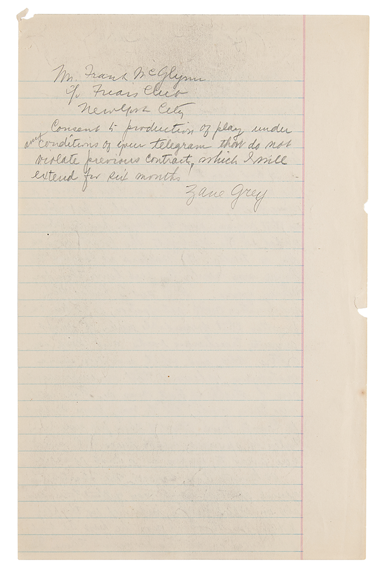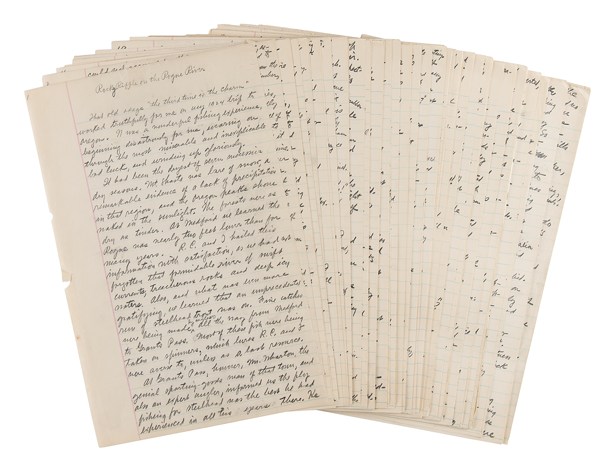 AMS in pencil, signed on the reverse of the first page, "Zane Grey," titled at the head, "Rocky Riffle on the Rogue River," 107 pages, no date but circa mid-1920s. Grey's original handwritten draft of a nonfiction work based on a trip taken in 1924, originally published in Field and Stream in 1926; the tale is also published in his 1928 book Tales of Fresh-Water Fishing. The piece begins, "That old adage 'the third time is the charm' worked truthfully for me in my 1924 trip to Oregon. It was a wonderful fishing experience, beginning disastrously for me, wearing on through the most miserable and inexplicable bad luck, and winding up gloriously." Engaging in a friendly fishing competition with his brother, R. C., Grey experiences one setback after another before he finally hits his groove: "My fish, feeling the hard strain again, started off on his determined down-stream course. I let him go, but gradually tightened my hold of the line as it dipped through my left hand. I had to hold him or lose him. How he fought! He even ceased tugging until he had most of my line out. Then began the slow work of drawing him back foot by foot. It took so long that dusk had fallen by the time we got our first glimpse of his color?The time came when he rose to the surface, and I saw clearly a bigger steelhead than I had landed. The luck of it! I felt sure of him. I had no torturing doubts or fears. And I gave him the strain of the rod until he was beaten." On the reverse of the first page, Grey writes and signs a note to Frank McGlynn of the Friars Club in New York City, consenting to the production of a play; on the back of page 60, he draws a small sketch of a woman's face. In overall fine condition.