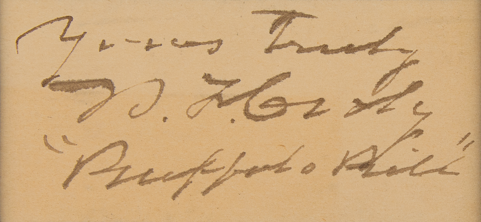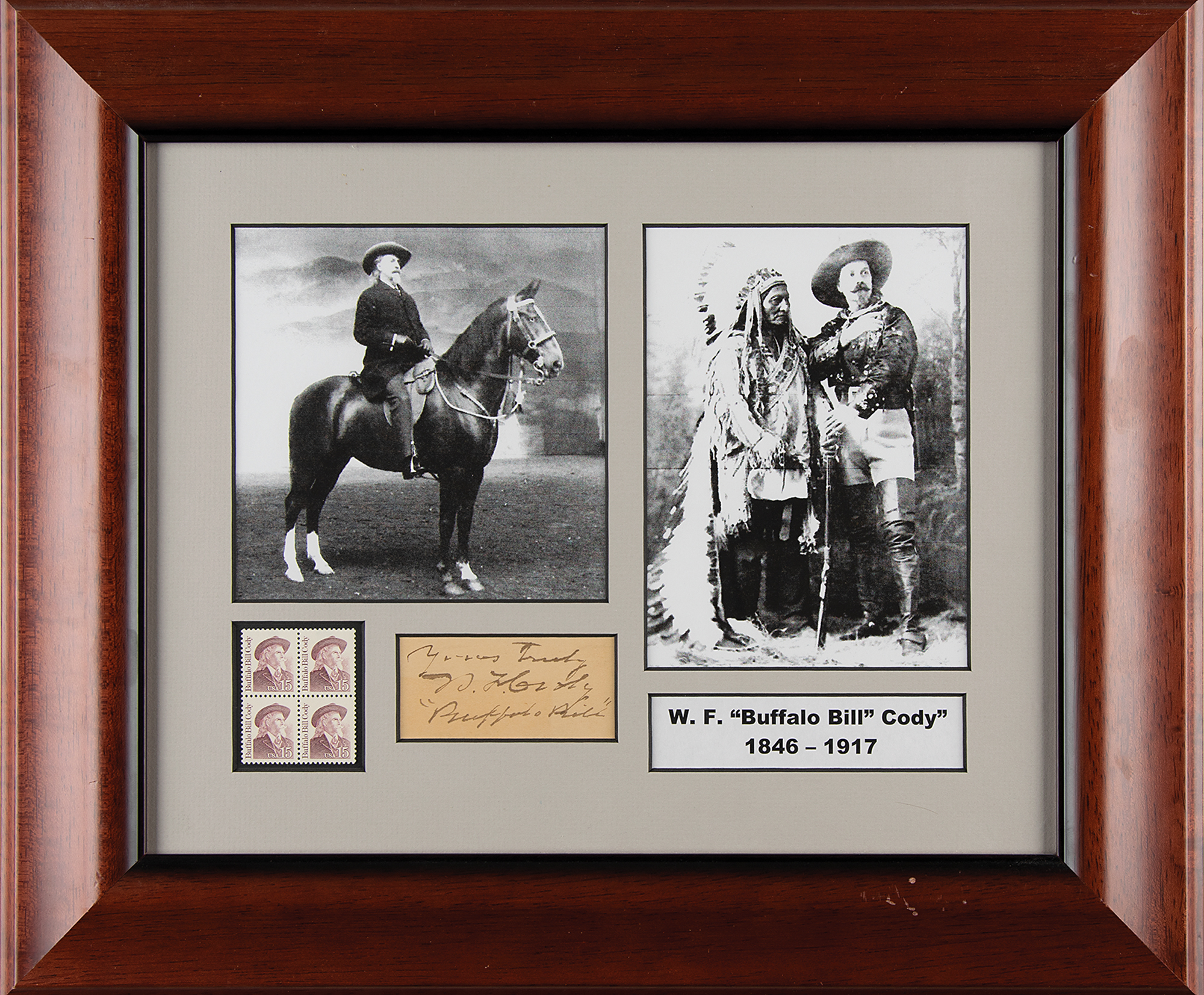 Sought-after ink signature, "Yours truly, W. F. Cody, 'Buffalo Bill,'" on an off-white 3.5 x 2 card, archivally matted and framed with two images and a stamp block to an overall size of 18 x 15. In fine condition.