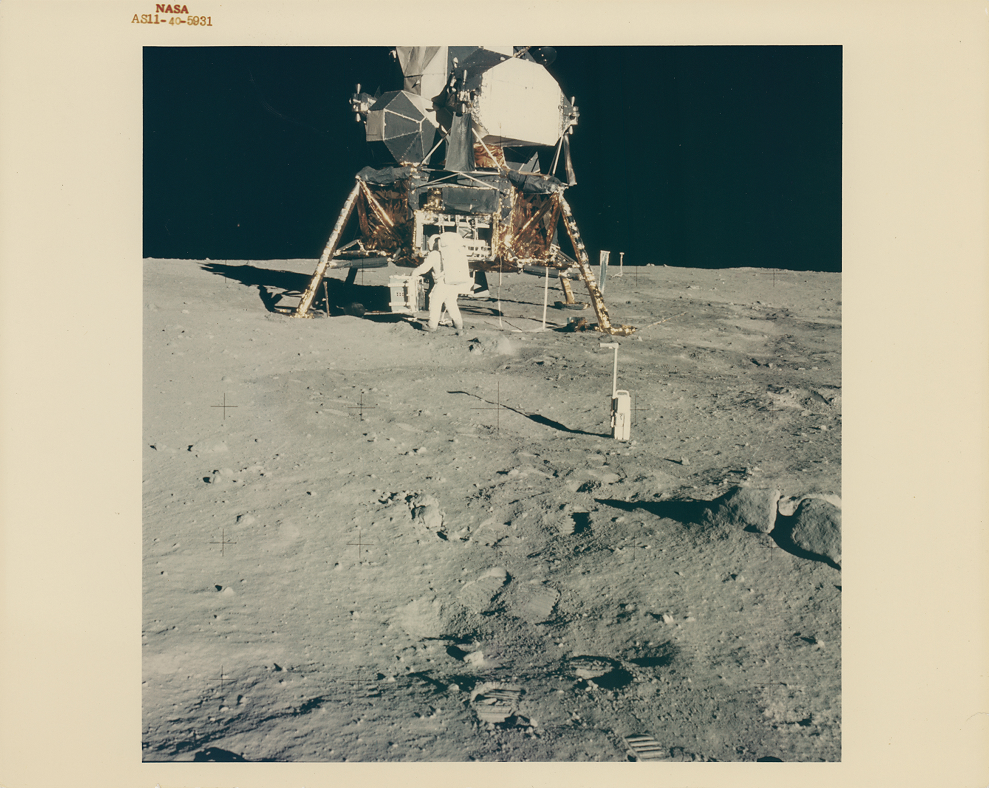 Sought-after official color glossy 10 x 8 red-numbered NASA photo (AS11-40-5931), which shows Lunar Module Pilot Buzz Aldrin unpacking the Laser Ranging Retroflector (LRRR) and the Passive Seismic Experiment Package (PSEP) from the Modularized Equipment Storage Assembly (MESA) in the LM Eagle’s descent module during the Apollo 11 mission. These experiments are part of the Early Apollo Scientific Experiments Package (EASEP). The Apollo Lunar Surface Closeup Camera (ALSCC) is in the foreground, and the Solar-Wind Composition (SWC) Experiment and the television camera are visible behind the LM. Reverse bears "A Kodak Paper" watermarks. In fine condition, with a trivial short tear to the lower right edge.