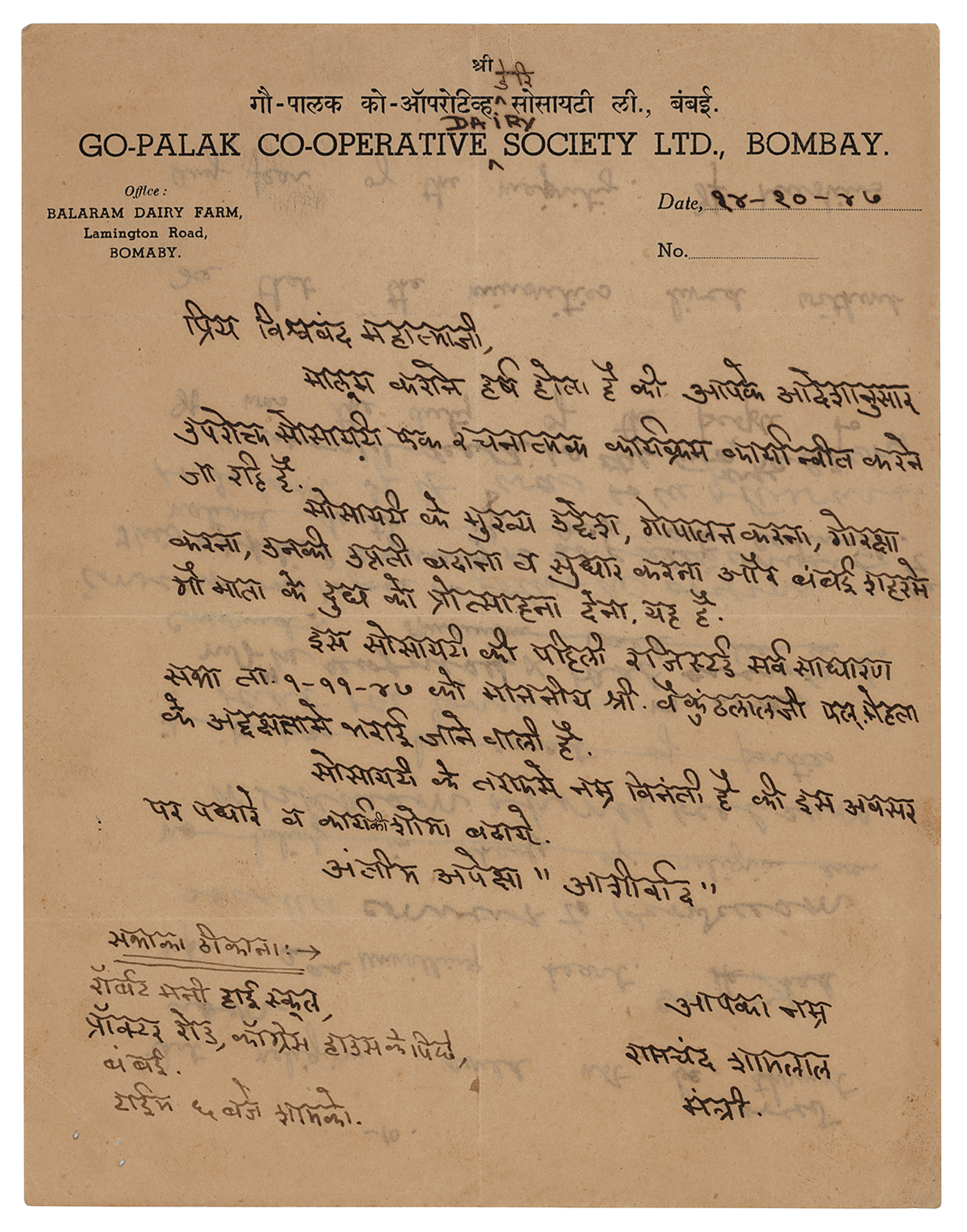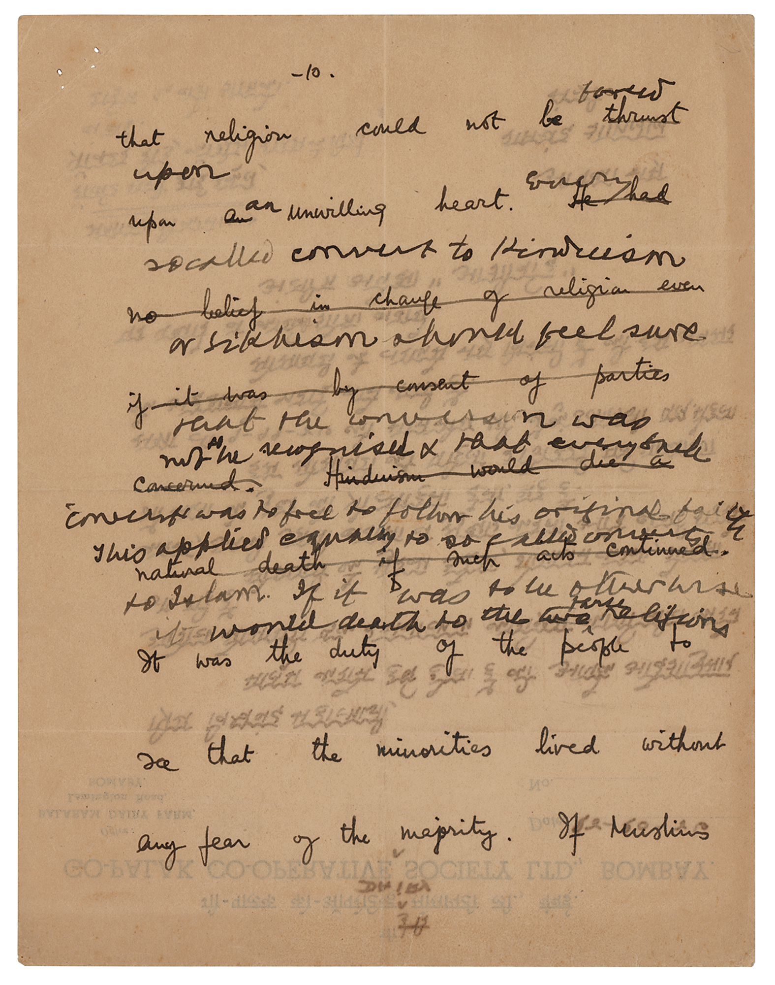 Partial hand-corrected manuscript by Mohandas Gandhi, one page, 6.5 x 8.25, on the reverse of a letter on Go-Palak Co-Operative Society letterhead written in an unknown hand. Gandhi strikes through several lines of the initial draft, marked as page "10" at the top, and pens a few lines in English. Gandhi writes, in part: "[Religion could not be] forced upon an [unwilling heart]. Even so called convert to Hinduism or Sikhism should feel sure that the conversion was not as he recognized & that every?convert was to free to follow his original faith. This applied equally to so called converts to Islam. If it was to be otherwise it would death to the two religions." In fine condition.