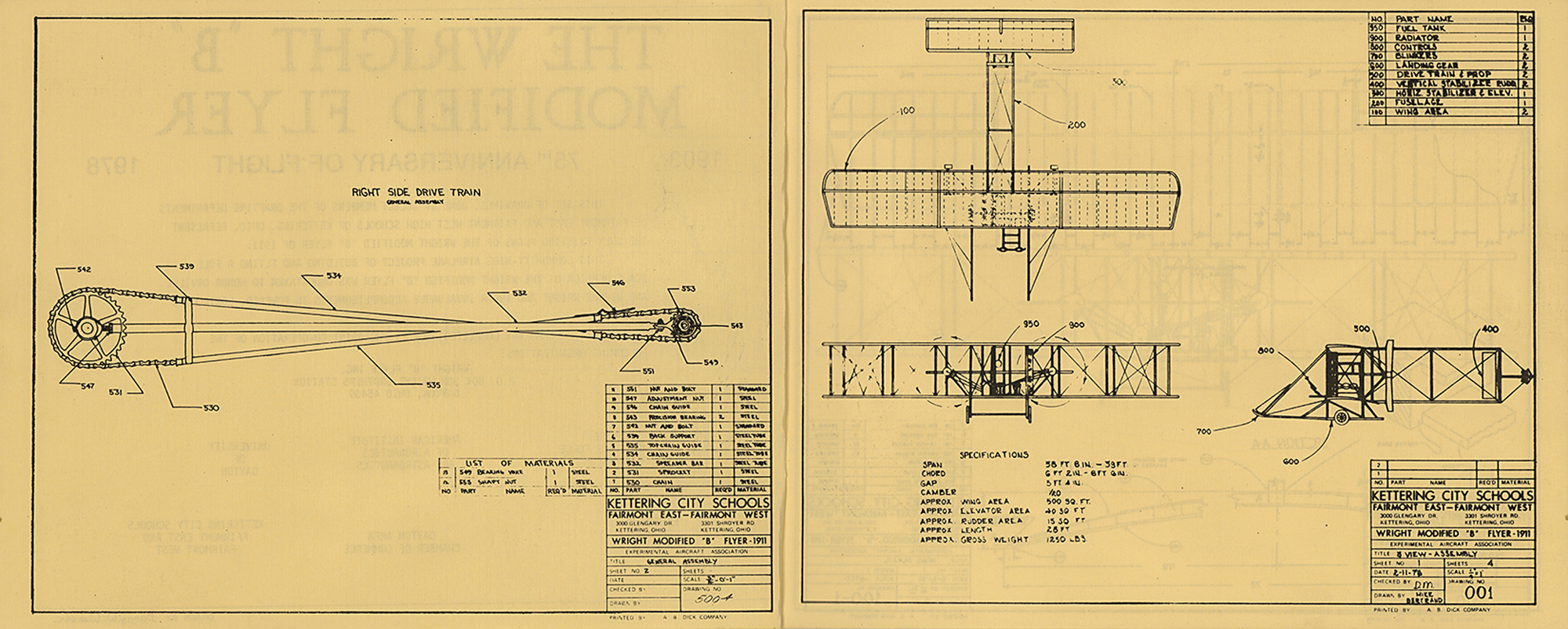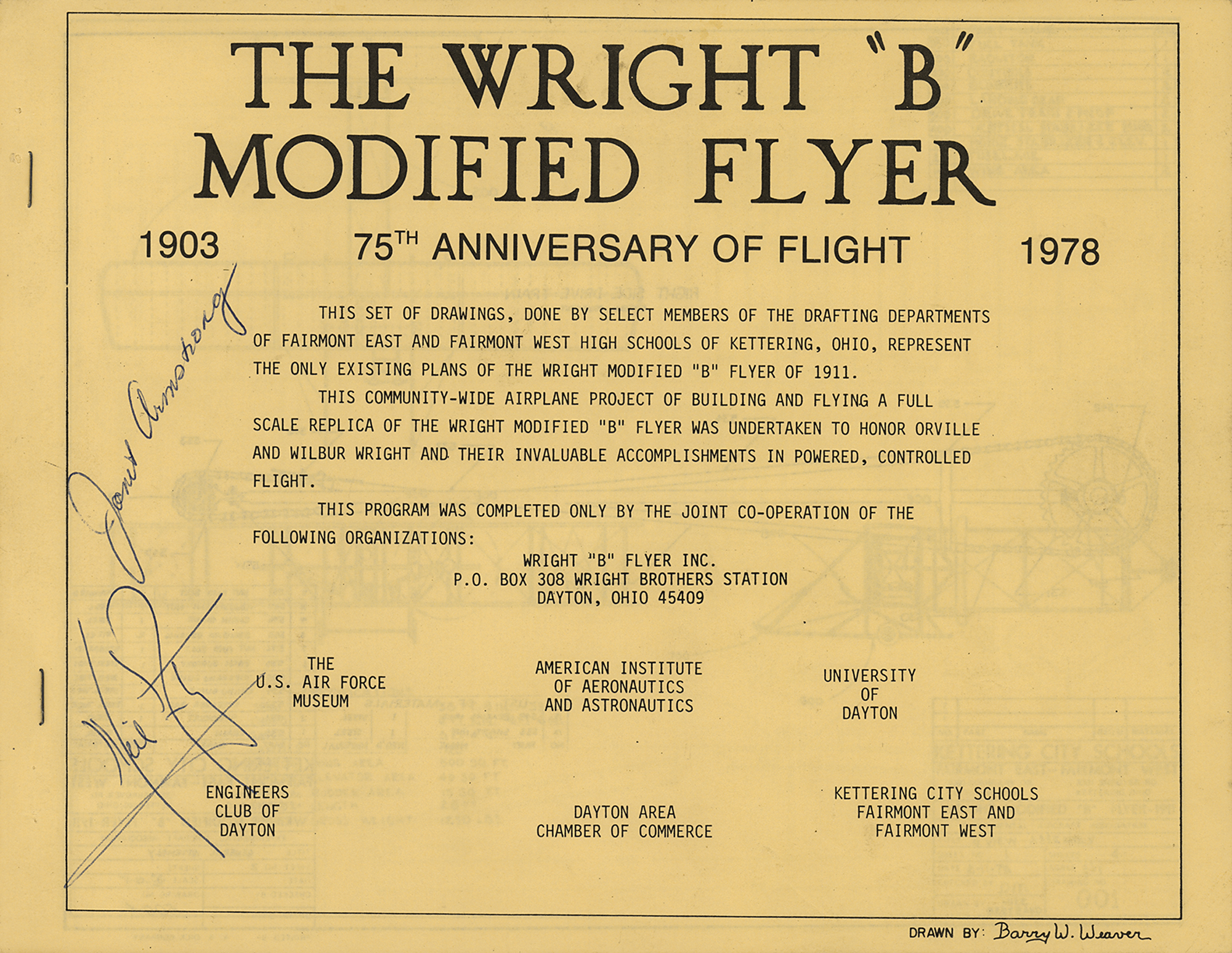 Very desirable schematics booklet entitled “The Wright ‘B’ Modified Flyer,” issued during the 1978 Enshrinement Ceremonies at the Aviation Hall of Fame, which coincided with the 75th anniversary of the Wright Brothers’ historic first flight on December 17, 1903. The stapled booklet, five pages, 11 x 8.5, is signed on the front cover in black ballpoint by Apollo 11 moonwalker Neil Armstrong, and by his first wife, Janet Shearon Armstrong. A caption on the front of the booklet reads: “This set of drawings, done by select members of the Drafting Departments of Fairmont East and Fairmont West High Schools of Kettering, Ohio, represent the only existing plans of the Wright Modified ‘B’ Flyer of 1911.” Includes the original 1978 Aviation Hall of Fame program and a pledge letter from Wright B. Flyer, Inc., seeking donations for the completion of “a modern, flying, lookalike version of the aircraft.” In fine condition. Accompanied by a full letter of authenticity from Zarelli Space Authentication.