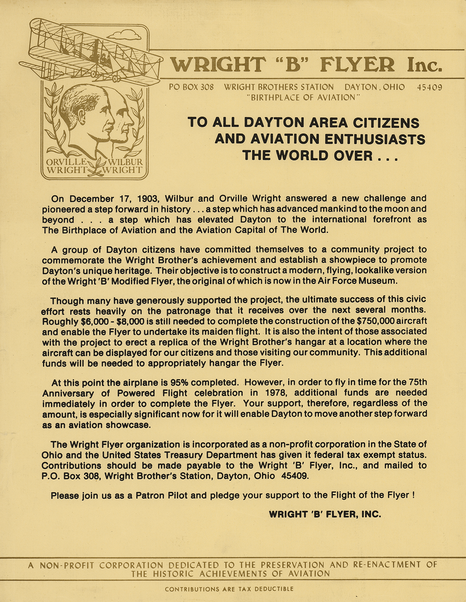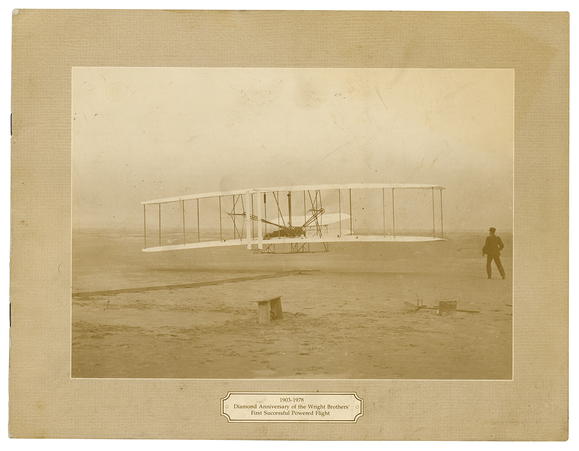An appealing association between aviation legends—during his Apollo 11 mission to the moon, Neil Armstrong carried in his ‘personal preference kit’ fabric and propeller remnants of the Wright Flyer, the craft flown by fellow Ohioans Wilbur and Orville Wright when they succeeded in taking the first powered flight on December 17, 1903, in Kitty Hawk, North Carolina.