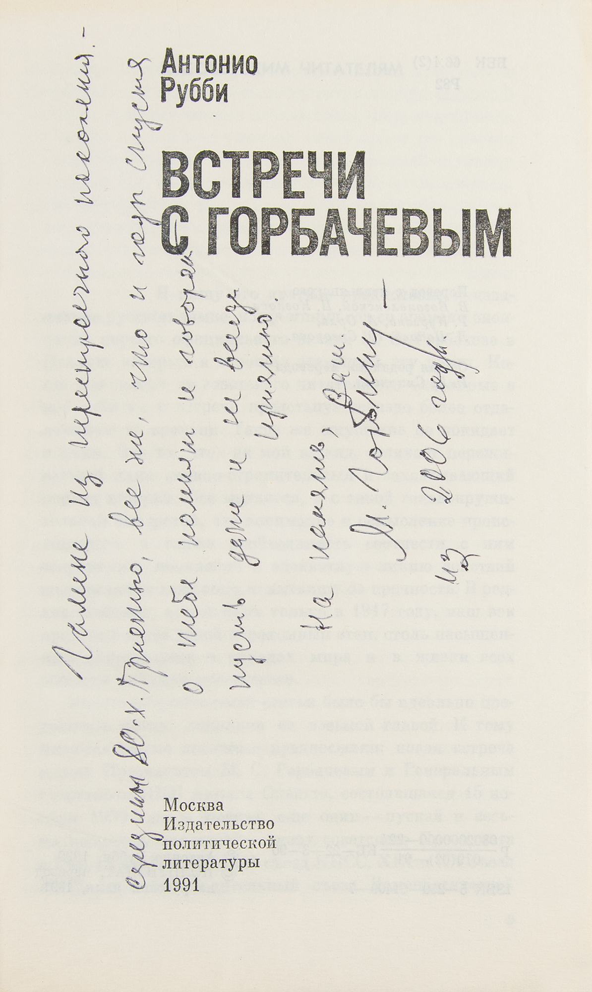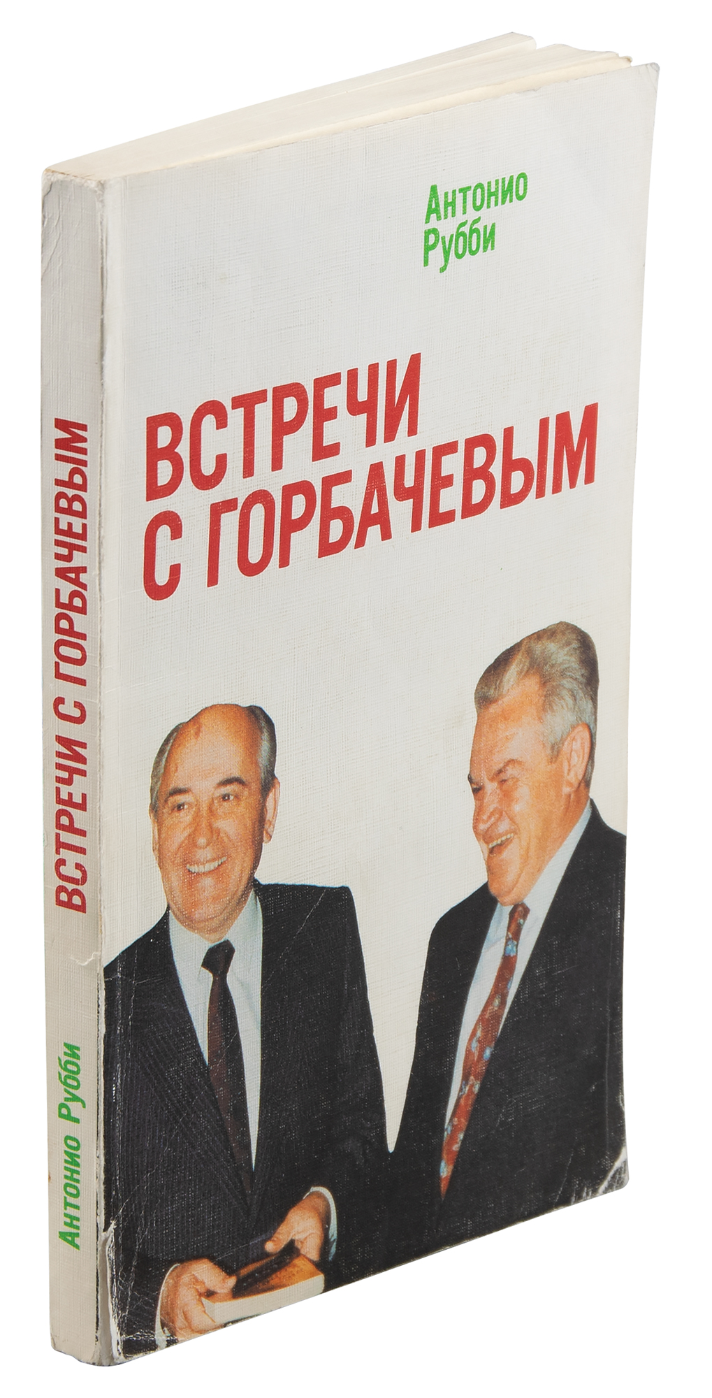 Signed Russian-language book: Meetings with Gorbachev. Moscow, 1991. Softcover, 5 x 7.75, 301 pages. Signed and inscribed vertically in Cyrillic on the title page in black ballpoint, "M. Gorbachev?2006." In fine condition, with light wear and creasing to the covers.
