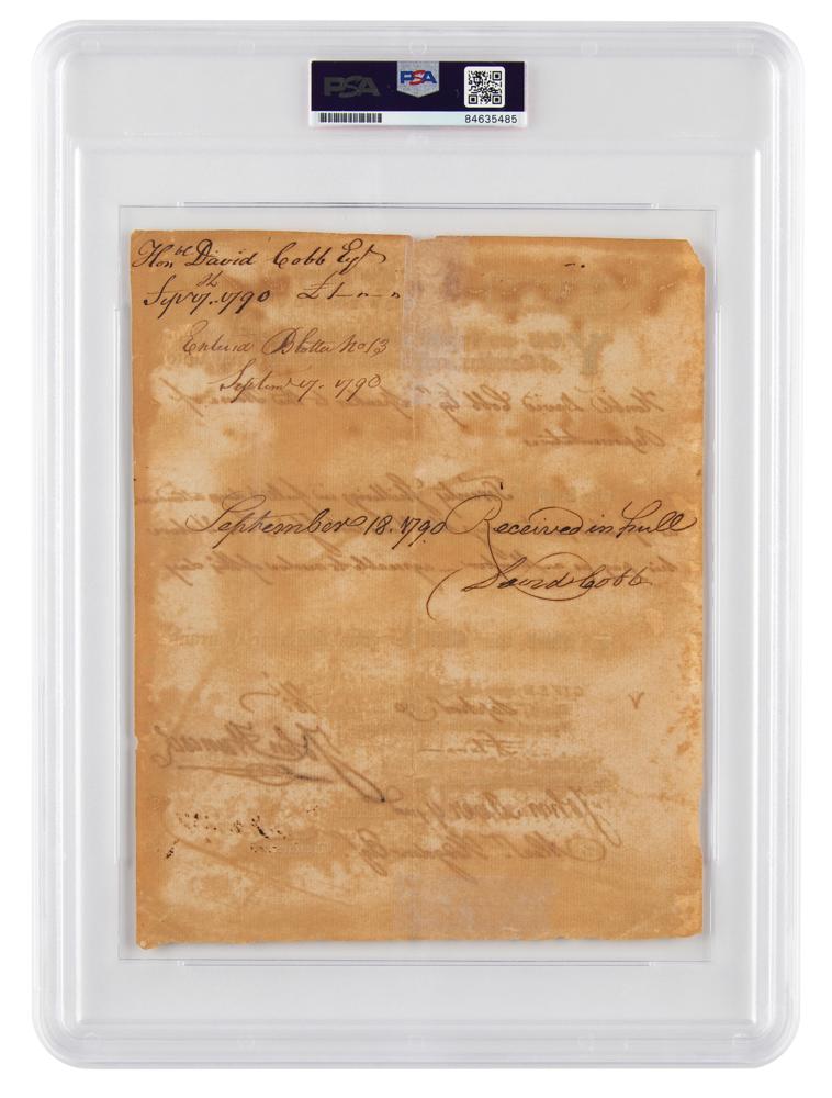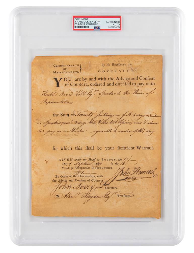 Partly-printed DS, one page, 7.25 x 9, September 17, 1790. As governor of Massachusetts, Hancock directs Treasurer Alexander Hodgdon “to pay unto Honble David Cobb Esq’r Speaker to the House of Representatives the Sum of Twenty Shillings in full 4 days attendance as Speaker?3 days this & one last Session, over & above his pay as a Member—agreeable to resolve of this day for which this shall be your sufficient Warrant." Signed prominently at the conclusion by John Hancock and countersigned by Secretary John Avery and by Treasurer Hodgdon. Signed on the reverse by Cobb (1748-1830), who served as the Speaker of the Massachusetts House of Representatives from May 1789 until January 1793. In very good to fine condition, with irregular overall toning, and two archival repairs on the reverse. Encapsulated in a PSA/DNA authentication holder. Prior to his holding of several high-ranking posts within the Commonwealth, including President of the Massachusetts Senate and the state's Lieutenant Governor, Cobb served as aide-de-camp to George Washington during the Revolutionary War. He was appointed Major General of Militia in 1786 and rendered conspicuous service during Shays' Rebellion. An exceptional document rife with noteworthy political Bay State figures.