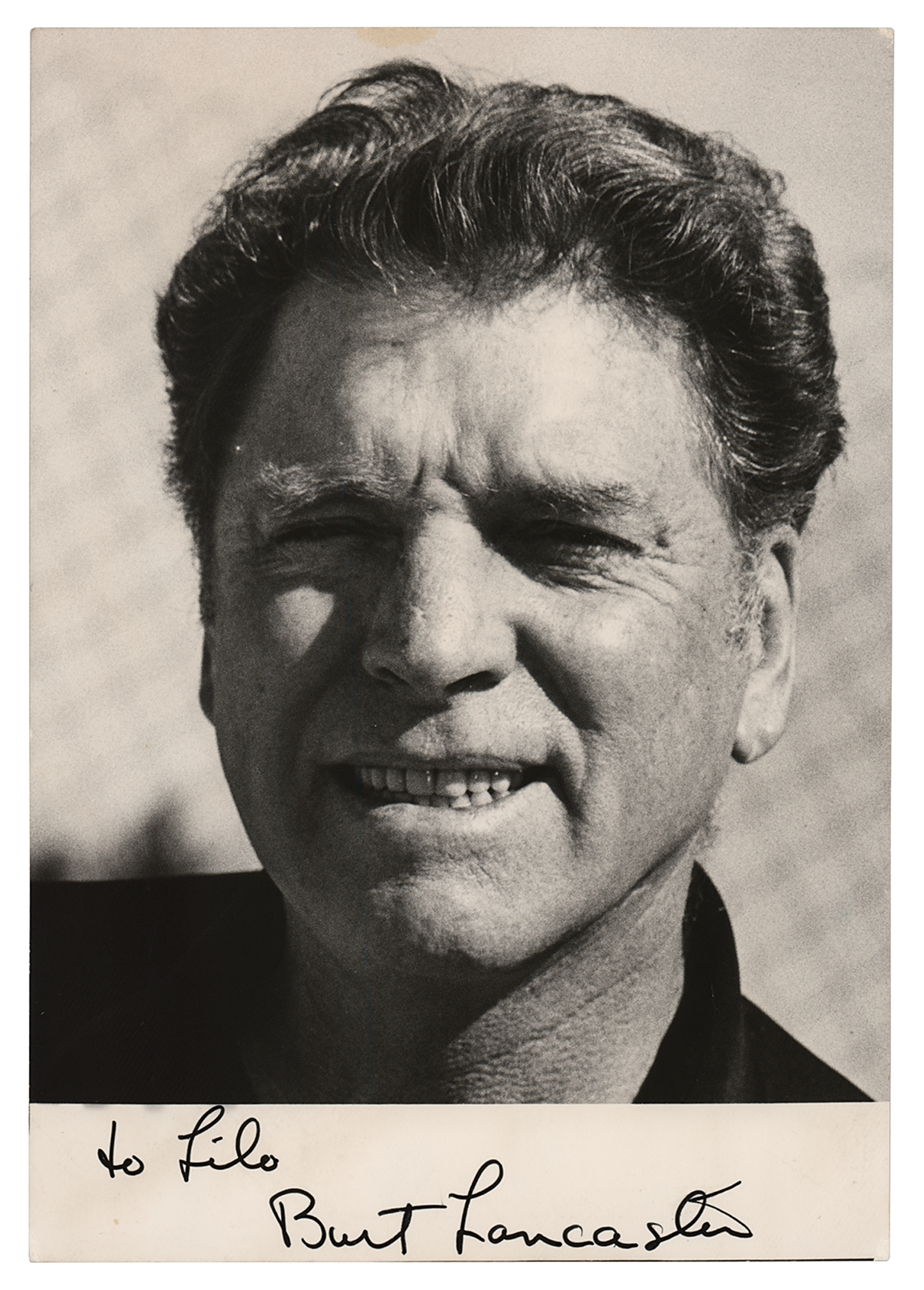 Matte-finish 4.75 x 7 close-up photo of the Oscar-winning actor in later age, signed and inscribed in the lower border in black ink, "To Lilo, Burt Lancaster.” In fine condition.