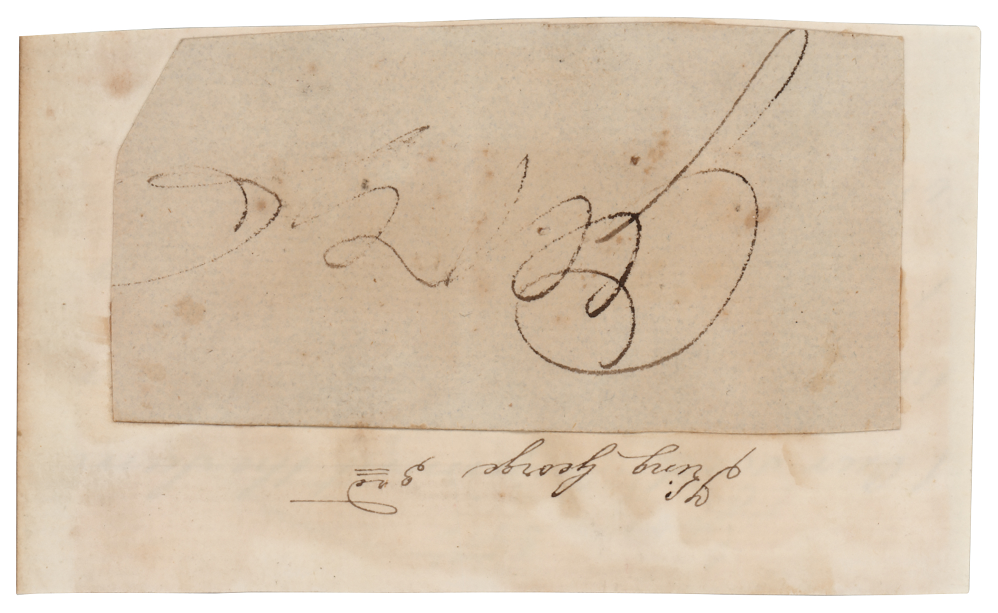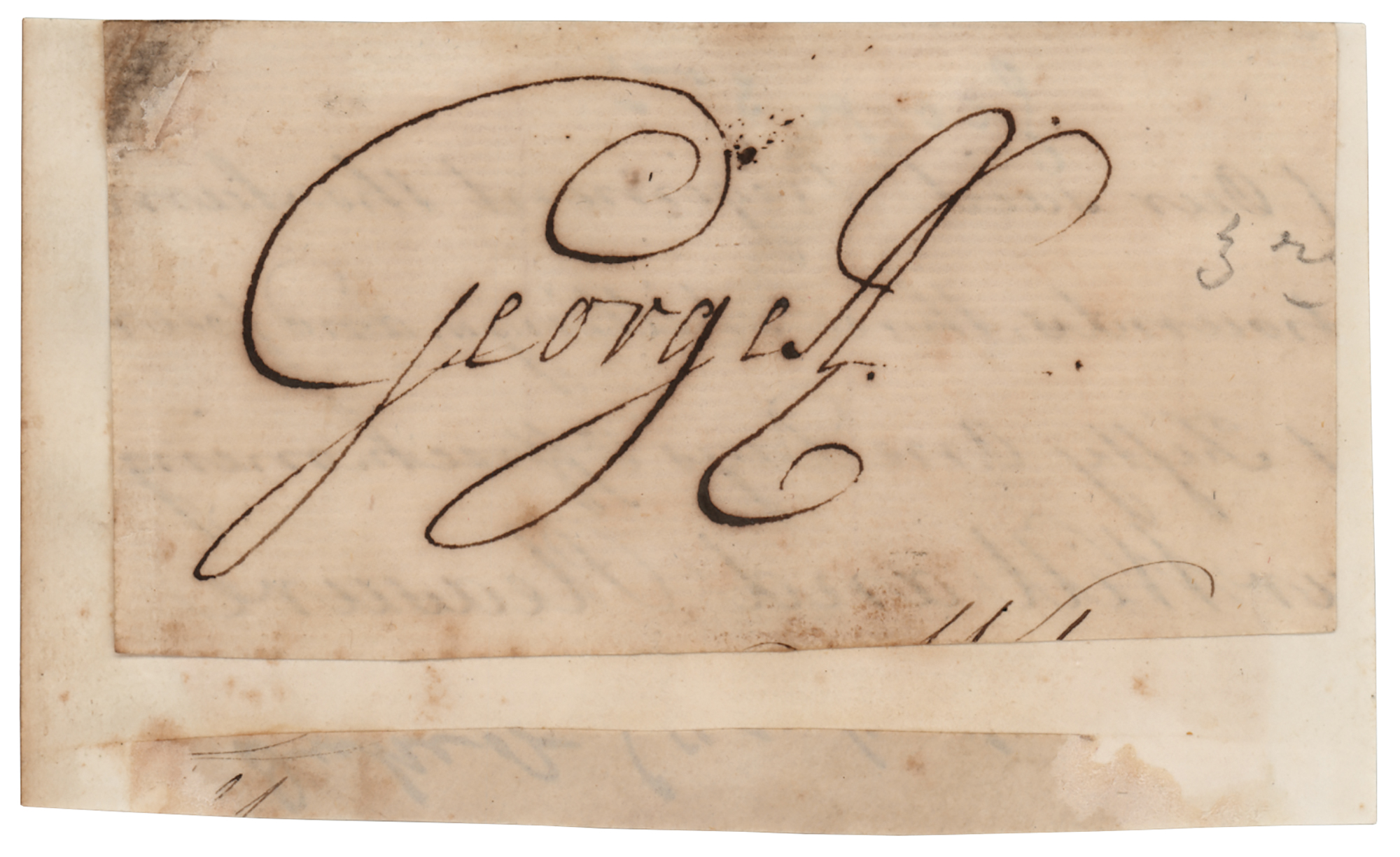 Two ink signatures of King George III, both reading “George R.,” penned on individual slips clipped from documents and affixed to either side of a 4.25 x 2.5 sheet. The autographs offer an interesting contrast, with the bolder, neater example written earlier in his reign, and the second lighter signature scrawled when the king’s vision had begun to deteriorate. In very good to fine condition.