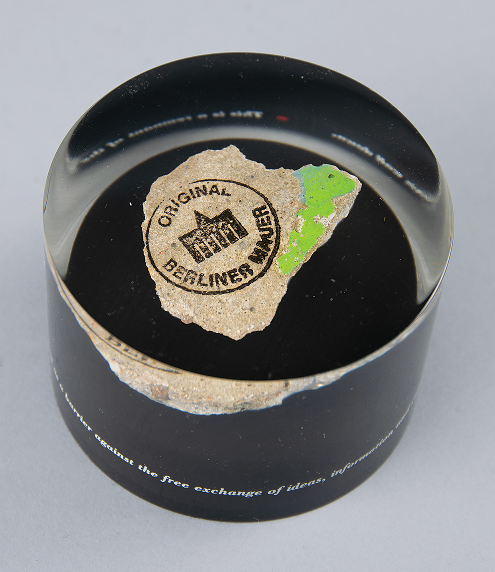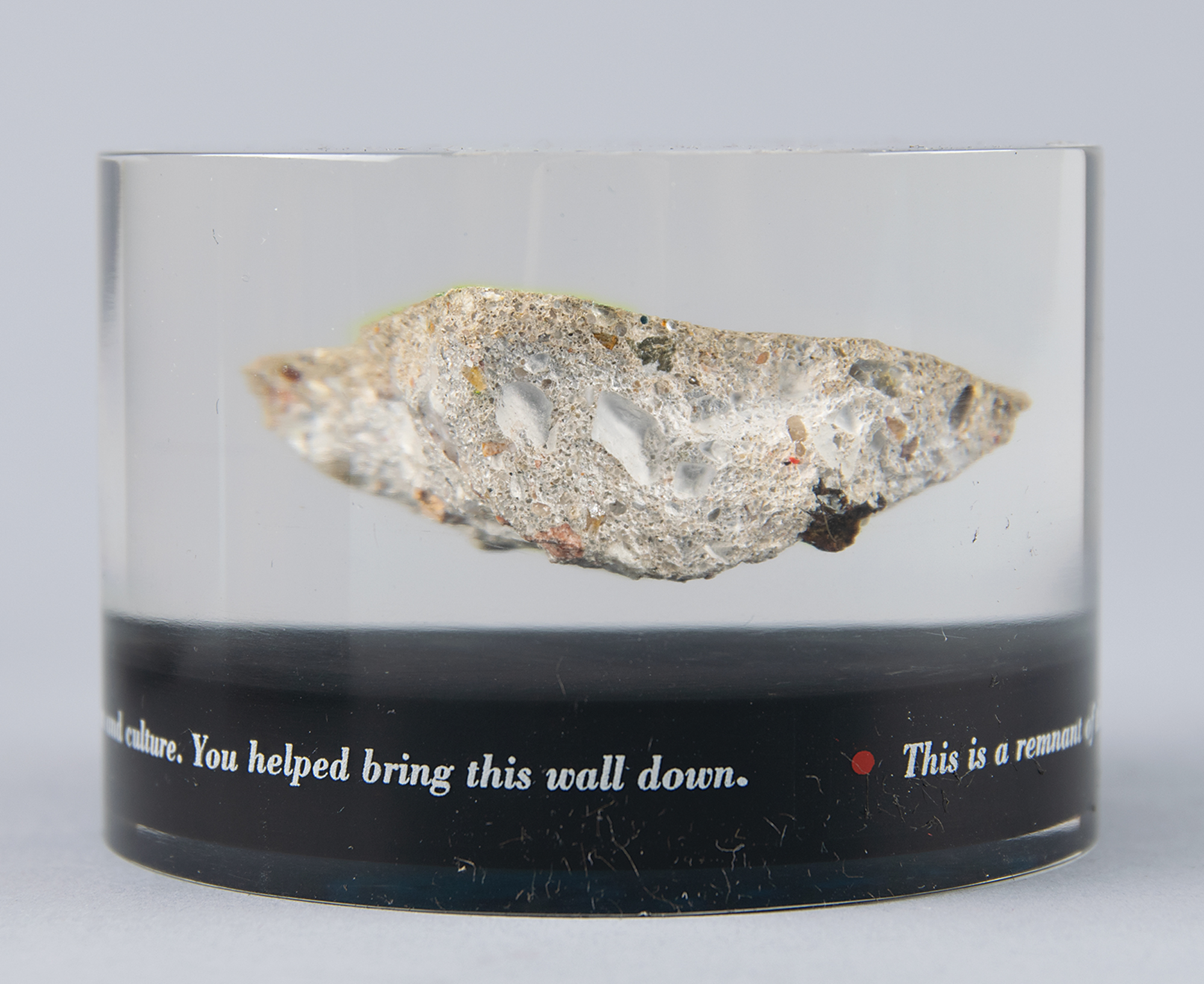 Original colored fragment of the Berlin Wall, 2" x 1.75" x 1", the top of which bears an authenticity stamp: "Original Berliner Mauer." The remnant is encased in a cylindrical piece of Lucite presented by Time Warner, 3.25" x 2.25", the base of which is encircled with the text: "This is a remnant of the Berlin Wall, which stood as a barrier against the free exchange of ideas, information and culture. You helped bring this wall down." Includes the original 'The whole world was watching…' presentation box. In fine condition, with light wear to the original box.