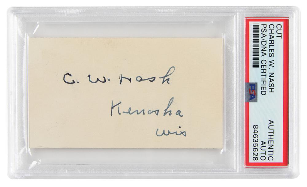 American automobile entrepreneur (1864-1948) who served as an executive in the automotive industry. He played a major role in building up General Motors as its 5th President. Vintage ink signature, "C. W. Nash, Kenosha, Wis.,” on an off-white 3.5 x 2 card. In very fine condition. Encapsulated in a PSA/DNA authentication holder.