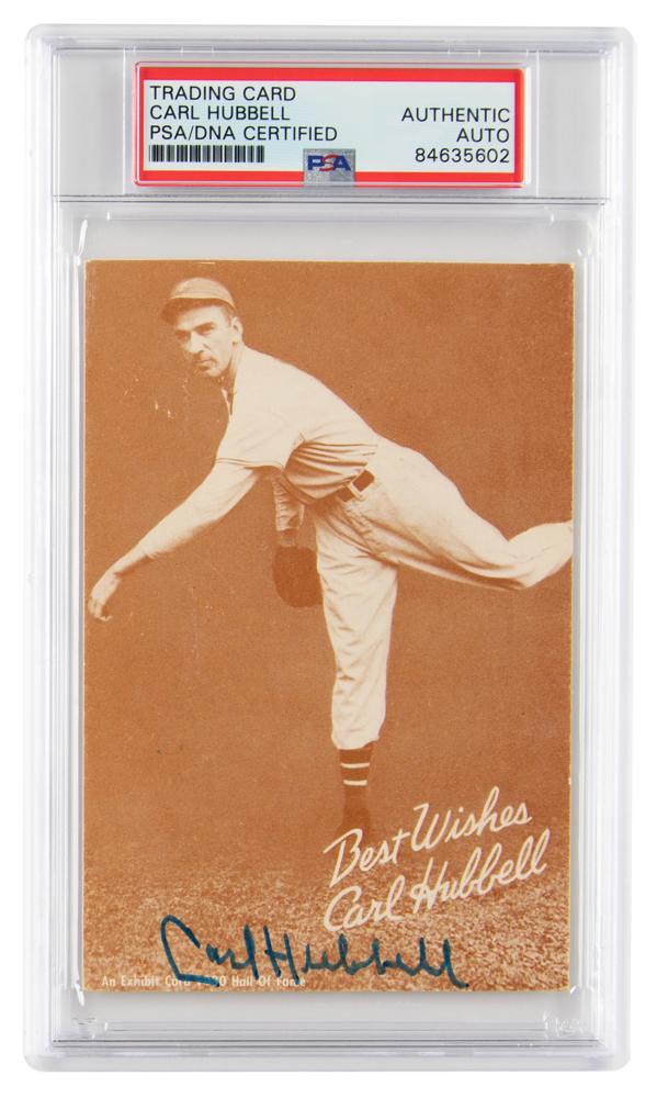 Vintage 3.5 x 5 exhibit card photo of Carl Hubbell delivering a pitch in his New York Giants uniform, signed in blue felt tip. The white autograph above is inherent to the card. In fine condition. Encapsulated in a PSA/DNA authentication holder.