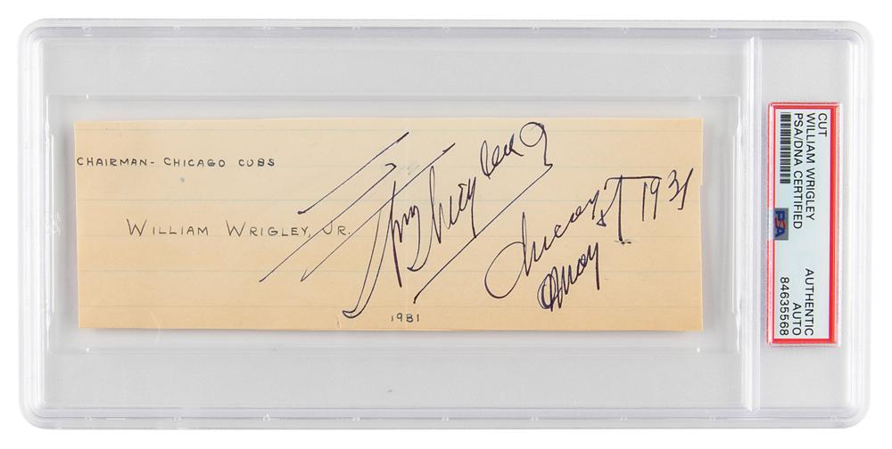 Founder of the Wrigley chewing gum company (1861-1932), he also held interests in hotels, mines, and the Chicago Cubs baseball team. Vintage ink signature, "Wm. Wrigley, Jr., Chicago, May 7, 1931,” on an off-white 7 x 2.25 sheet. In fine condition, with some light toning. Encapsulated in a PSA/DNA authentication holder.