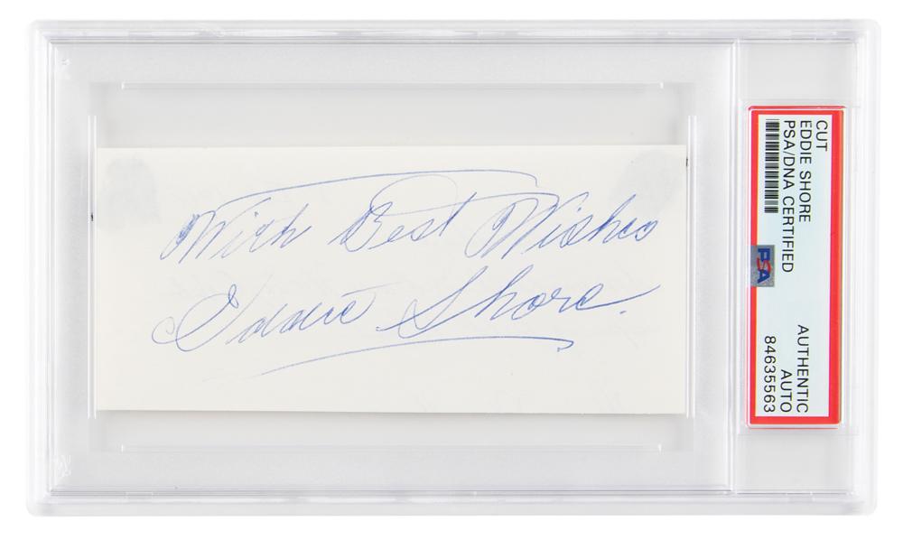 Ballpoint signature, "With best wishes, Eddie Shore,” on an off-white 5 x 2.25 sheet clipped from a letter sent to Shore in 1968. In fine condition, with show-through at the top corners from old mounting remnants on the back. Encapsulated in a PSA/DNA authentication holder.
