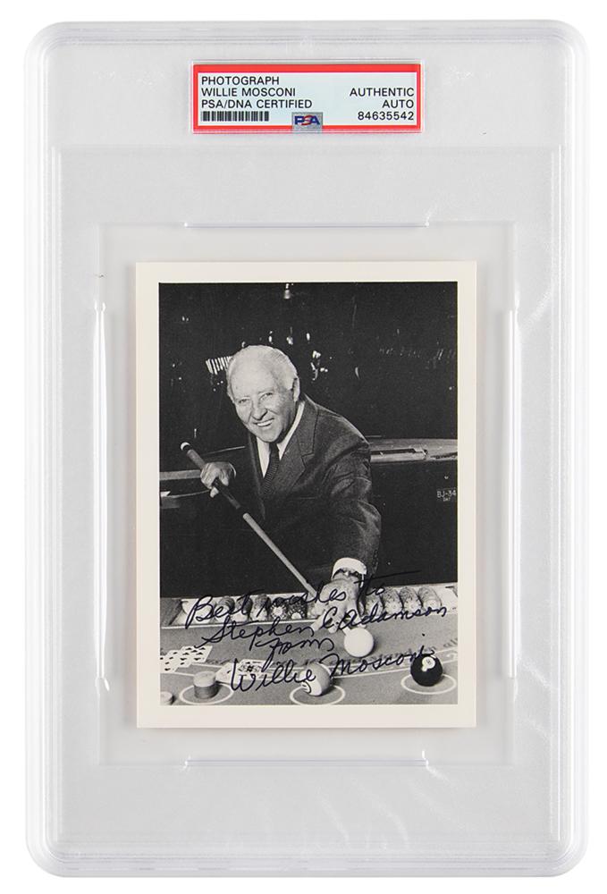 Semi-glossy 4 x 5.5 cardstock photo of Mosconi at the pool table, signed and inscribed in black felt tip, "Best wishes to Stephen C. Adamson, from, Willie Mosconi.” In fine condition. Encapsulated in a PSA/DNA authentication holder.