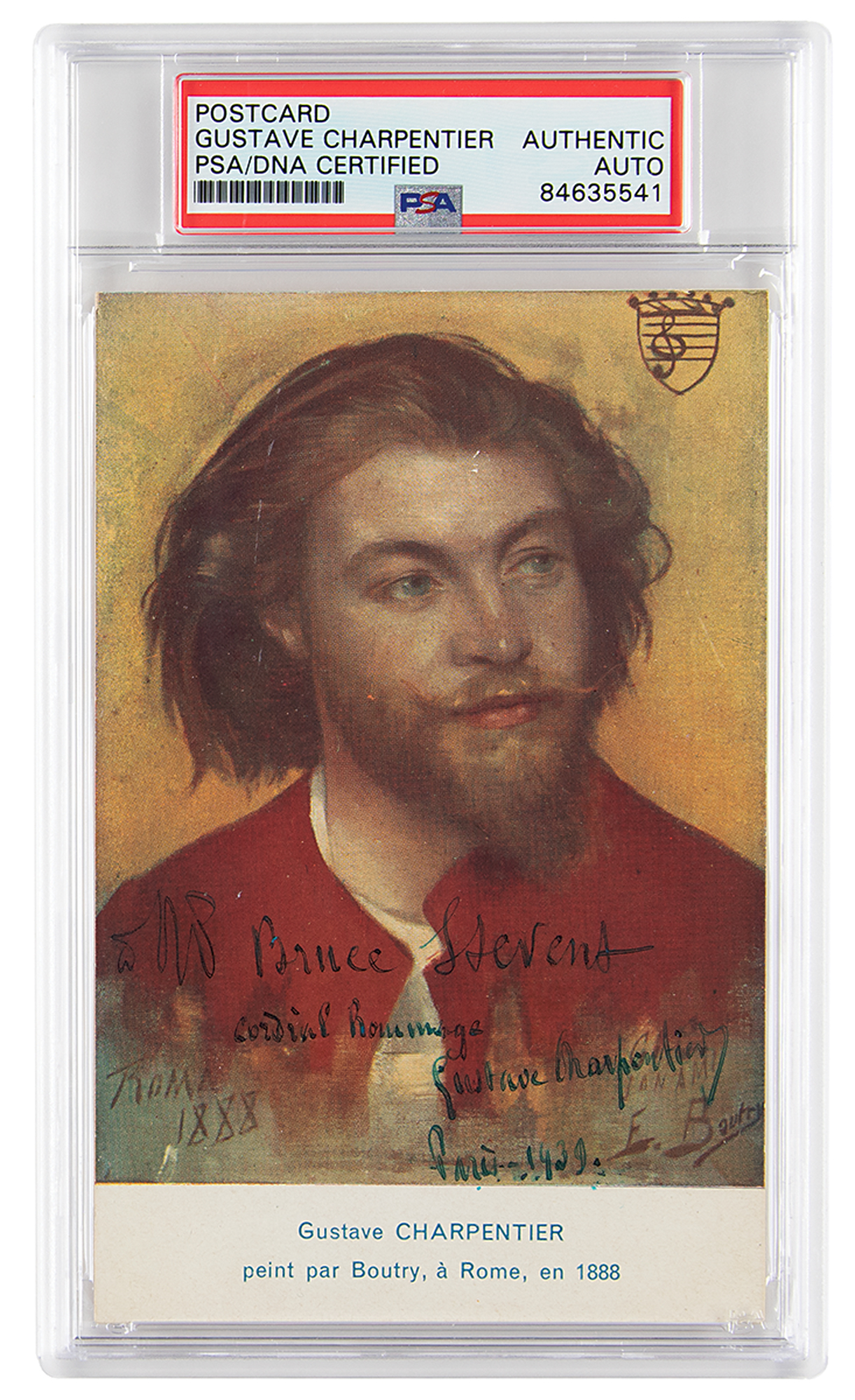 Color 3.5 x 5.5 postcard photo of an 1888 portrait painting of Gustave Charpentier, signed and inscribed in fountain pen, "To Mr. Bruce Stevens, cordial hommage, Gustave Charpentier, Paris 1939.” In fine condition. Encapsulated in a PSA/DNA authentication holder.