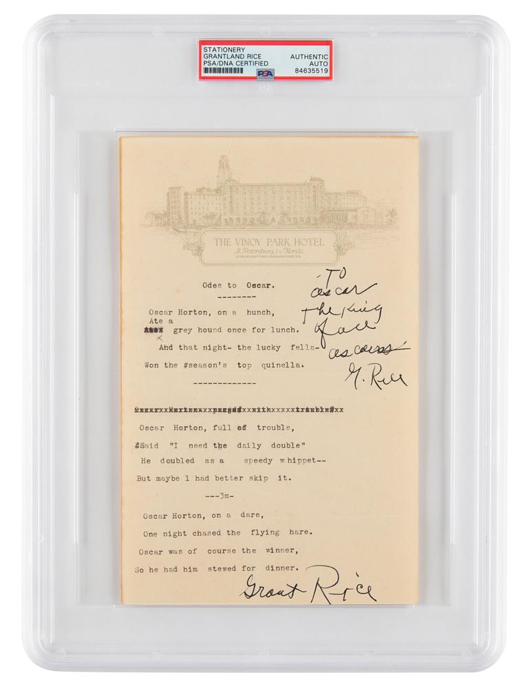 Early 20th-century American sportswriter (1880-1954) known for his elegant prose and whose writing was published in newspapers around the country and broadcast on the radio. He famously dubbed the great backfield of the 1924 Notre Dame Fighting Irish football team the ‘Four Horsemen’ of Notre Dame. Typed poem on a sheet of 6 x 9.5 The Vinoy Park Hotel stationery, signed and inscribed in fountain pen, “To Oscar, the king of all Oscars, G. Rice,” who signs again at the conclusion, “Grant Rice.” The poem, entitled “Odes to Oscar,” in part: “Oscar Horton, on a hunch / Ate a grey hound for lunch. / And that night—the lucky fella— / Won the season’s top quinella.” In fine condition. Encapsulated in a PSA/DNA authentication holder.