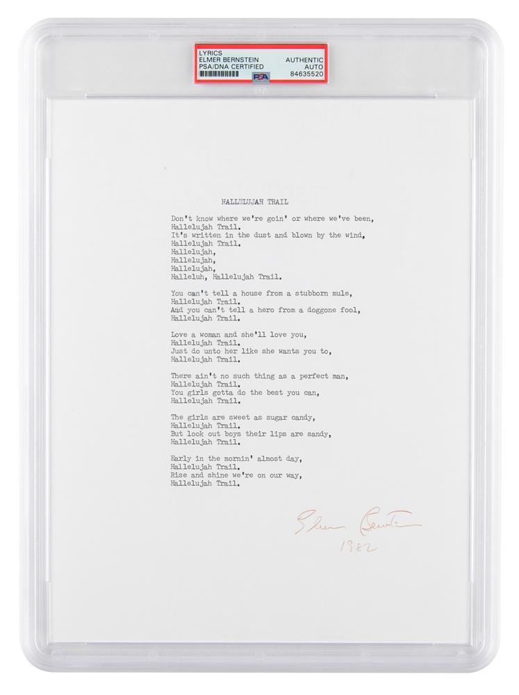 Souvenir typescript of the lyrics to the ‘Hallelujah Trail,’ one page, 8.5 x 11, signed at the conclusion in black ballpoint, “Elmer Bernstein, 1982.” The lyrics, in part: “Don’t know where we’re goin’ or where we’ve been, Hallelujah Trail. / It’s written in the dust and blown by the wind, Hallelujah Trail.” In fine condition. Encapsulated in a PSA/DNA authentication holder.