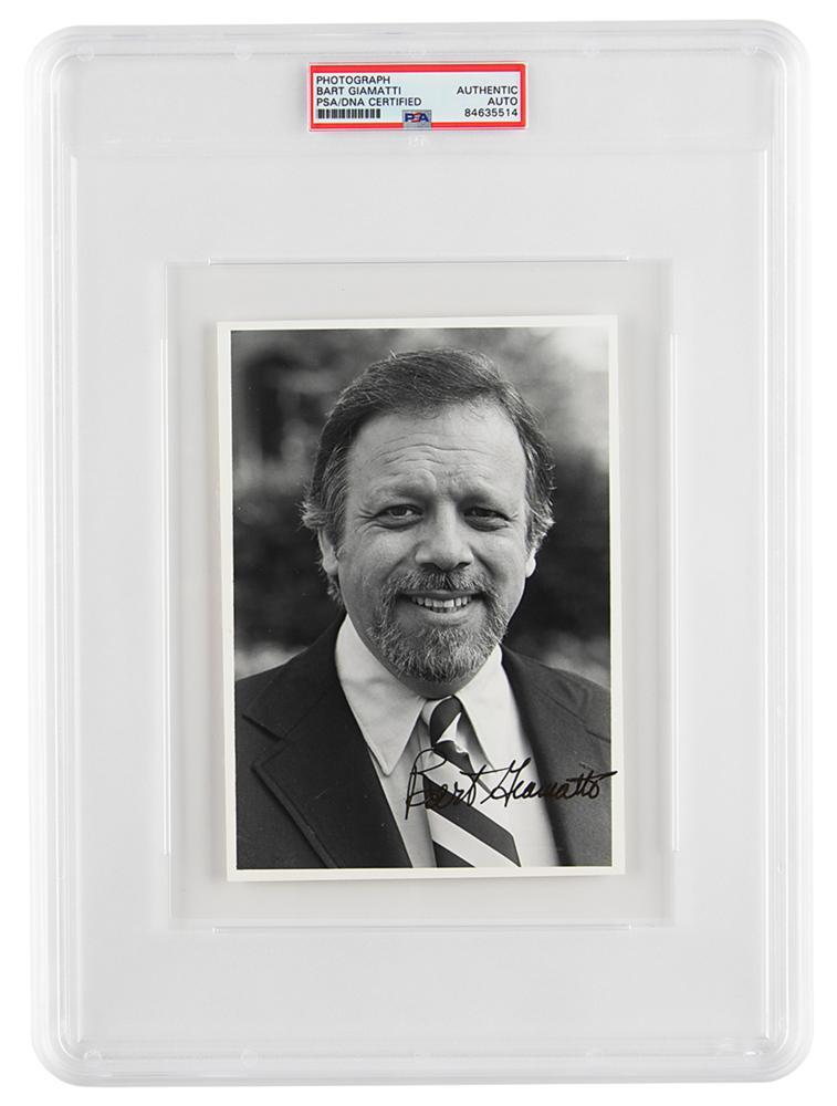 President of Yale University and the seventh Commissioner of Major League Baseball (1938-1989). Great glossy 5 x 7 photo of Commissioner Giamatti in a front-facing pose, signed in bold fountain pen. In fine condition. Encapsulated in a PSA/DNA authentication holder.