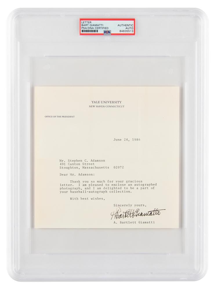 President of Yale University and the seventh Commissioner of Major League Baseball (1938-1989). TLS signed “A. Bartlett Giamatti,” one page, 7 x 6.75, Yale University letterhead, June 24, 1986. Letter to Stephen Adamson, in full: "Thank you so much for your gracious letter. I am pleased to enclose an autographed photograph, and I am delighted to be a part of your baseball-autograph collection." In fine condition. Encapsulated in a PSA/DNA authentication holder.