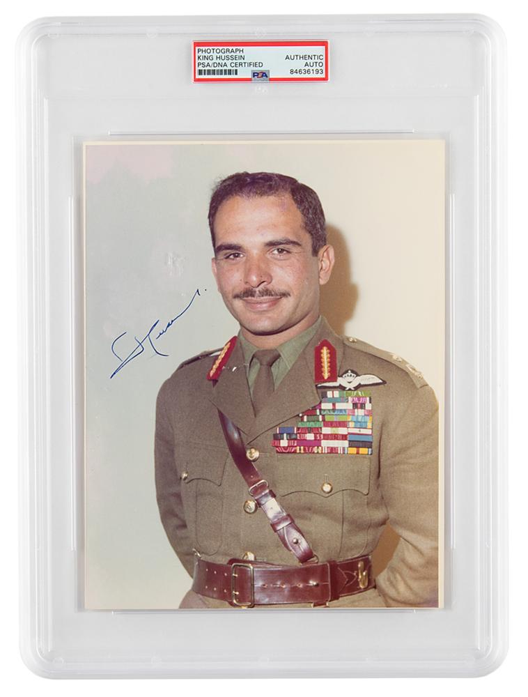 Color glossy 7 x 9.25 photo of King Hussein of Jordan in uniform, signed in blue felt tip. In very good condition, with overall creasing, including a noticeable central vertical crease. Encapsulated in a PSA/DNA authentication holder.