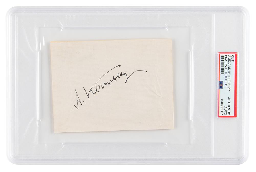 Provisional leader of the Soviet Union (1881-1970) from July to November 1917, when he was unseated by Lenin and forced into exile. Vintage fountain pen signature, "A. Kerensky,” on an off-white 5 x 3.75 sheet. In very good to fine condition, with light overall wrinkling. Encapsulated in a PSA/DNA authentication holder.