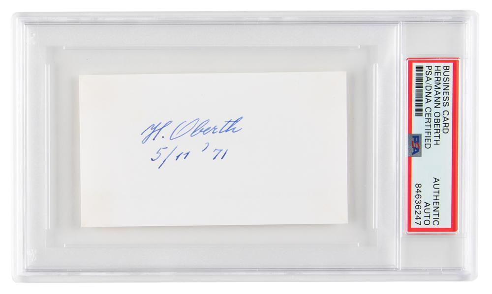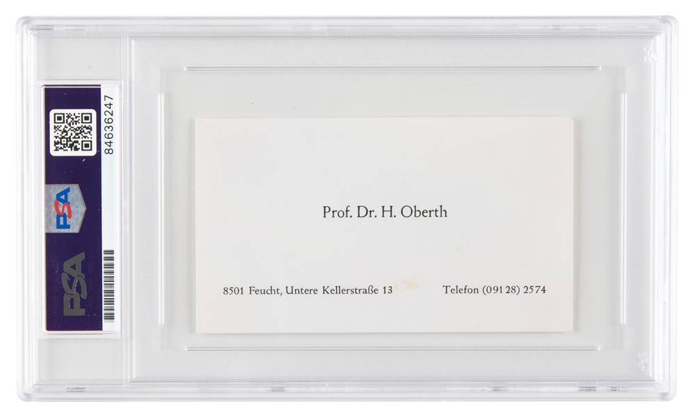 Ballpoint signature of the German rocket scientist, "H. Oberth, 5/11 '71,” on the reverse of his off-white 4 x 2.25 business card, imprinted on the front with his name, address, and phone number. In very fine condition. Encapsulated in a PSA/DNA authentication holder.