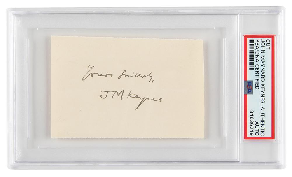 Highly influential British economist (1883-1946) who was the chief British representative at the 1944 Bretton Woods conference that established the International Monetary Fund. Fountain pen signature, "Yours sincerely, J. M. Keynes,” on an off-white 4 x 2.5 slip. In very fine condition. Encapsulated in a PSA/DNA authentication holder.