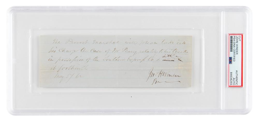 Confederate general (1800-1865) noted for commanding prisoner-of-war camps throughout the South during the war, including Andersonville and Libby Prisons. Manuscript DS, signed “Jno. H. Winder,” one page, 7.5 x 2.5, May 5, 1862. In part: "The Provost Marshall will please take into his charge the case of Mr. Pearry, relating to his trunk in possession of the Southern Express Co." In fine condition. Encapsulated in a PSA/DNA authentication holder.