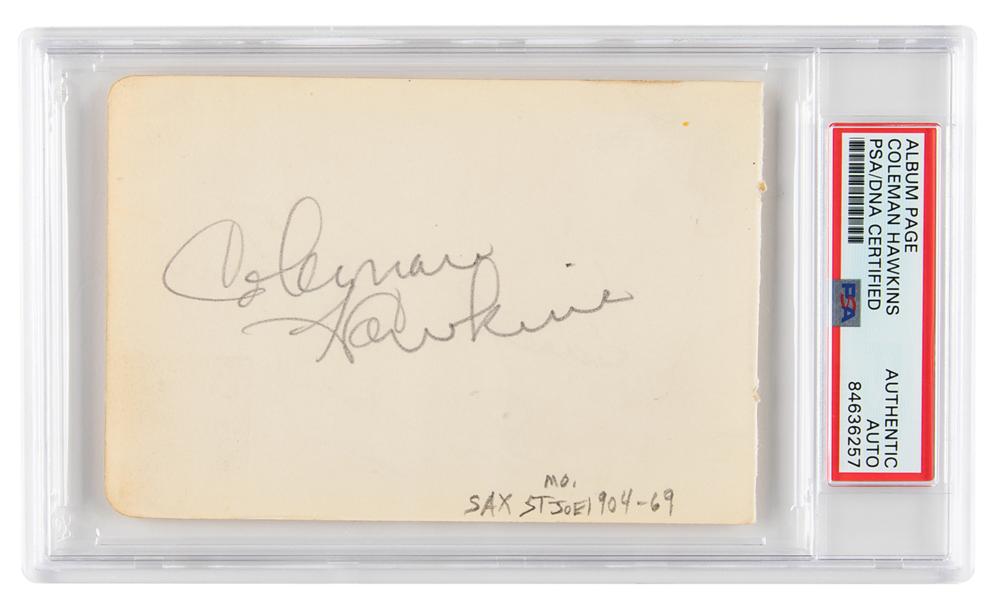 American jazz tenor saxophonist (1904-1969), nicknamed 'Hawk' and occasionally 'Bean,' who was strongly associated with the swing music and big band era, and played a role in the development of bebop in the 1940s. Vintage pencil signature, "Coleman Hawkins,” on an off-white 5 x 3.25 album page. In fine condition. Encapsulated in a PSA/DNA authentication holder.