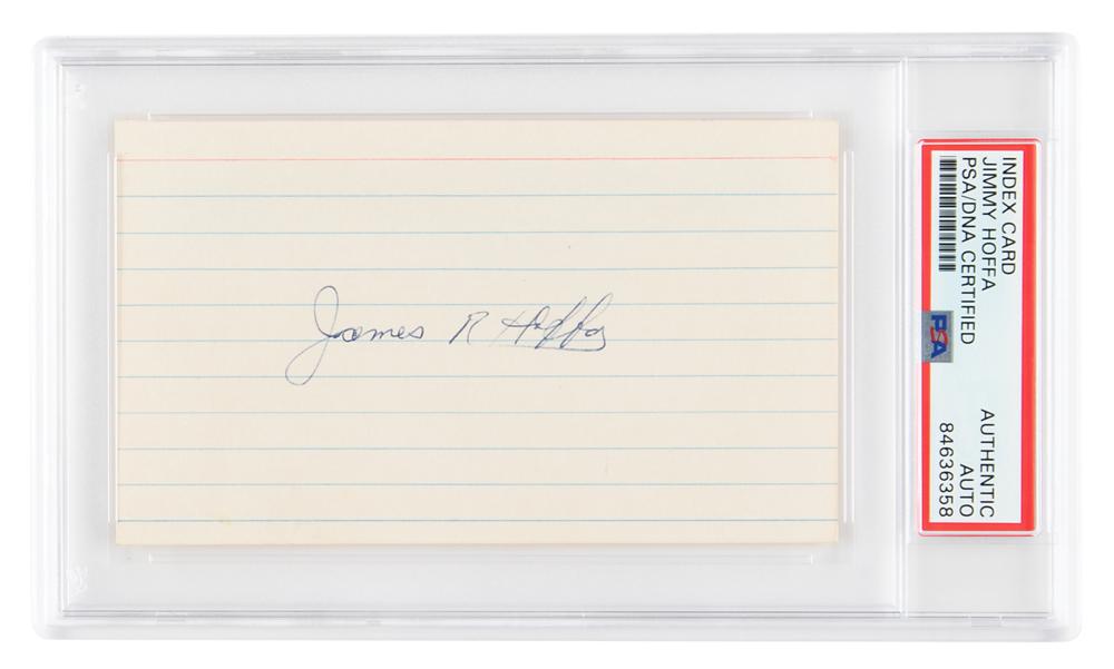 Uncommon ballpoint signature of the controversial labor leader, "James R. Hoffa,” on an off-white 5 x 3 card. In fine condition. Encapsulated in a PSA/DNA authentication holder.