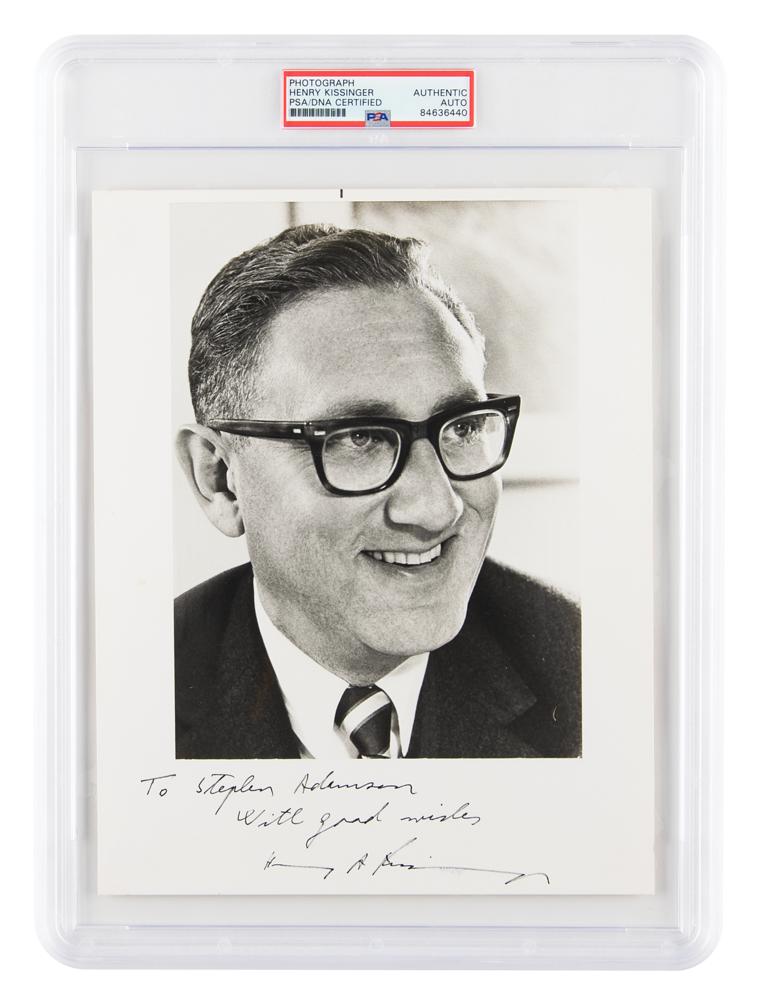 Glossy 7.75 x 9.75 photo of the youthful politician during his days as National Security Advisor, signed and inscribed in the lower border in black felt tip, "To Stephen Adamson, With good wishes, Henry A. Kissinger.” Reverse bears an "Official Photograph / The White House" stamp. In fine condition. Encapsulated in a PSA/DNA authentication holder.