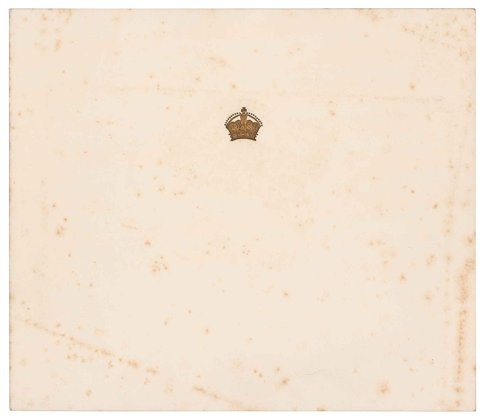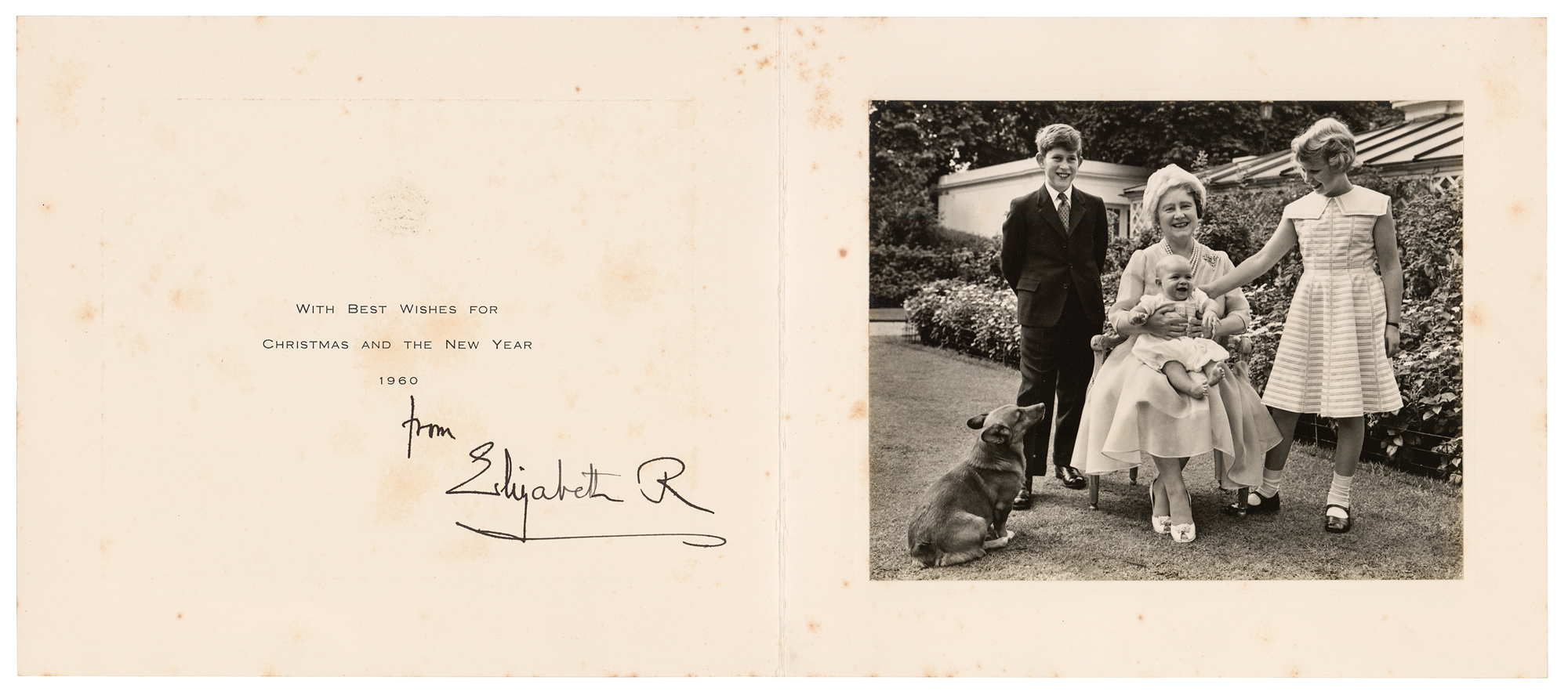 Christmas card from 1960 featuring an embossed royal crown on the front, measuring 18 x 7.75 open, with an affixed portrait of Queen Elizabeth seated and accompanied by her three grandchildren, signed inside below a printed greeting in bold black ink, “from Elizabeth R.". In very good to fine condition, with scattered light foxing.