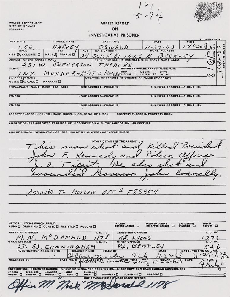 Facsimile copy of the Dallas Police Department arrest report for Lee Harvey Oswald, one page, 8.5 x 11, dated November 22, 1963, the day that Oswald was arrested for shooting President John F. Kennedy and Police Officer J. D. Tippit, and listing “M. N. McDonald, 1178” as the arresting officer. Signed in the lower border in black felt tip, “Officer M. ‘Nick’ McDonald, 1178.” In fine condition.