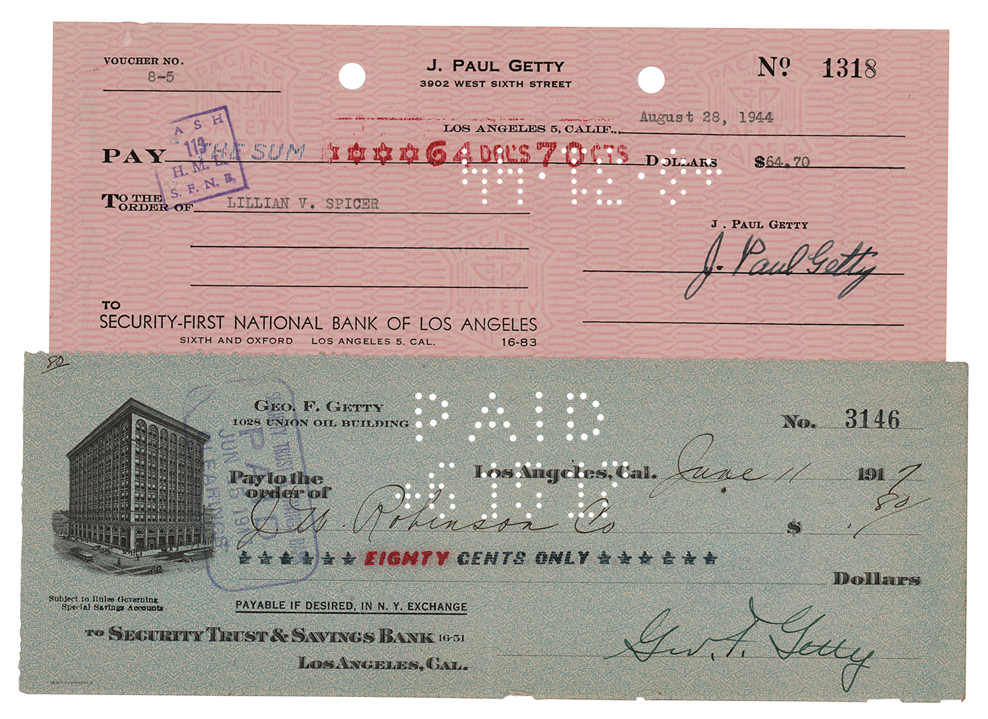 Two Getty family checks: a personal check filled out in another hand and signed by the pioneer oilman, “Geo. F. Getty,” payable to J. W. Robinson Co. for 80 cents, June 11, 1917; and a personal check filled out in type and signed by his son, "J. Paul Getty," payable to Lillian V. Spicer for $64.70, December 15, 1942. In overall fine condition.