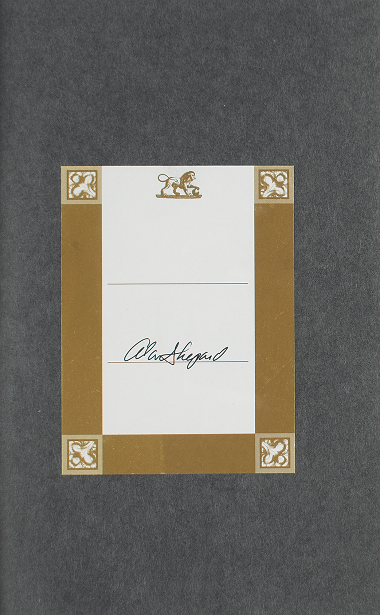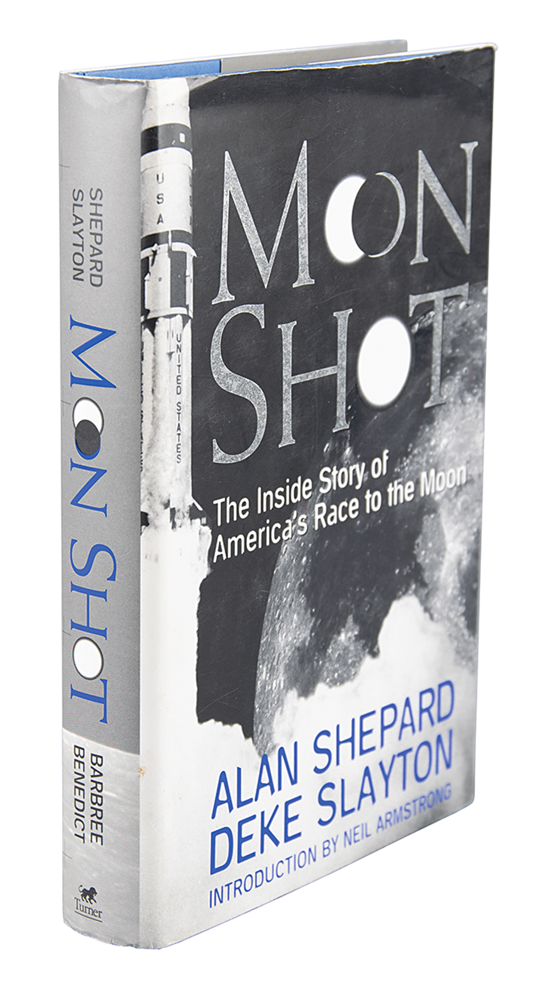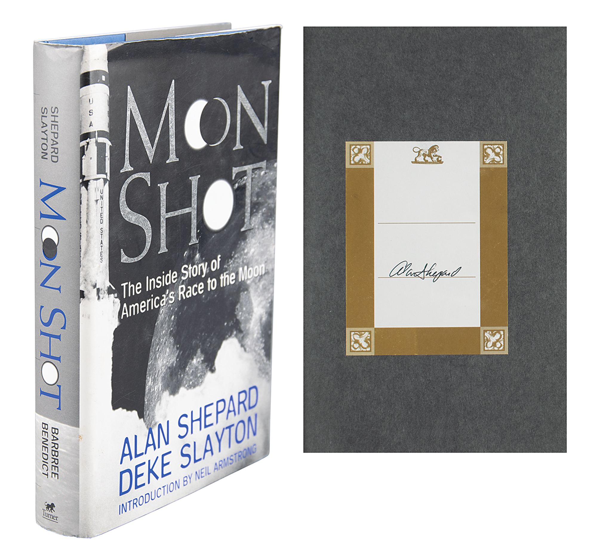 Signed book: Moon Shot. First edition. Atlanta, GA: Turner Publishing, 1994. Hardcover with dust jacket, 6.5 x 9.25, 383 pages. Signed in black ink by Alan Shepard on a bookplate affixed to the opening page. In fine condition, with creasing to the top edge of the dust jacket.