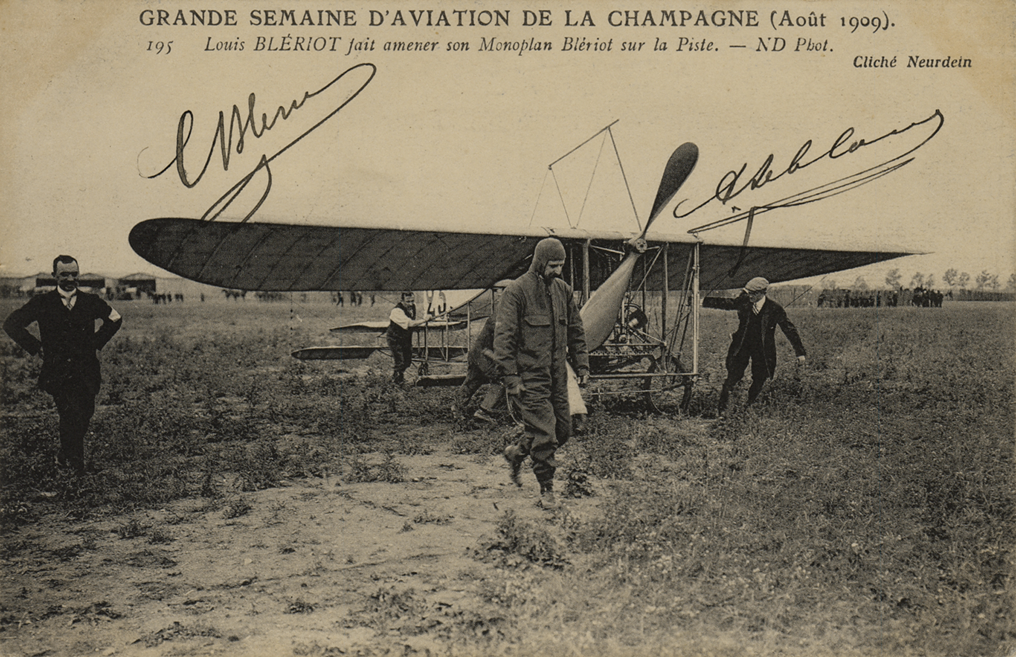 Scarce vintage matte-finish 5.5 x 3.5 postcard photo of Louis Bleriot in his pilot uniform walking in front of his monoplane during the Grande Semaine d'Aviation de la Champagne in August 1909, with his assistant, Alfred Leblanc, walking alongside the aircraft, signed by both men in fountain pen, “L. Bleriot” and “A. Leblanc.” In fine condition, with light toning to the corners.